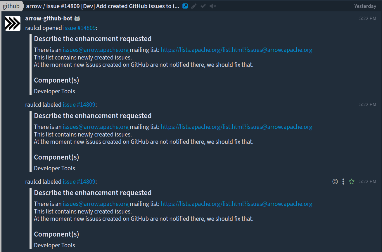 One of the problems with the current notifications is that every time a new issue is created as we are adding labels, assignee, etcetera we get double or tripled notifications. As an example the creation of this issue and the addition of the labels, see the time is the same because it is basically the same action (issue created):  -- This is an automated message from the Apache Git Service. To respond to the message, please log on to GitHub and use the URL above to go to the specific comment. To unsubscribe, e-mail: [email protected] For queries about this service, please contact Infrastructure at: [email protected]