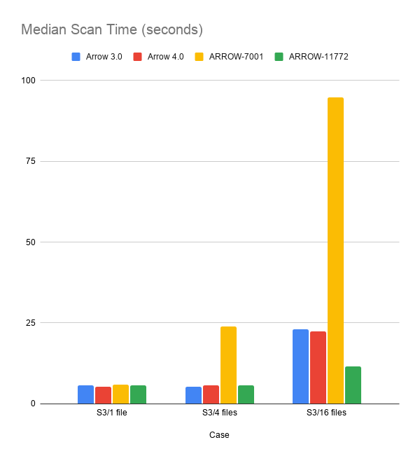 The dataset tested was a 16-file feather dataset, scanning either 1, 4, or