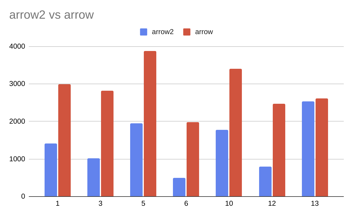 (Command `cargo run --release --bin tpch -- benchmark datafusion --iterations 5 --path [path] --format parquet --query [query] --batch-size 8192 -p 16`, SF=10 dataset) arrow2 | arrow -- | -- 1414,39 | 2994,92 1010,86 | 2826,7 1951,55 | 3871,32 504,08 | 1987,25 1778 | 3399,45 792,82 | 2470,72 2536,1 | 2611,67 Great work @jorgecarleitao @houqp @yjshen and others :D -- This is an automated message from the Apache Git Service. To respond to the message, please log on to GitHub and use the URL above to go to the specific comment. To unsubscribe, e-mail: [email protected] For queries about this service, please contact Infrastructure at: [email protected]
