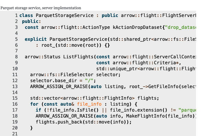 It seems like a large portion of the lines in the Java, Python, and C++ cookbooks go past the code block width. This seems particularly bad for [the C++ Flight example](https://arrow.apache.org/cookbook/cpp/flight.html#simple-parquet-storage-service-with-arrow-flight) (pictured below). We should look into widening this and potentially making the font slightly smaller (it's currently 17% larger than the font size in the Apache Arrow User Guide code blocks.)  -- This is an automated message from the Apache Git Service. To respond to the message, please log on to GitHub and use the URL above to go to the specific comment. To unsubscribe, e-mail: [email protected] For queries about this service, please contact Infrastructure at: [email protected]