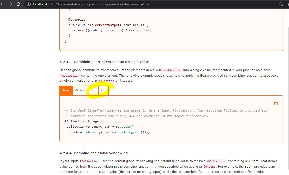 @robertwb, I found a couple of shortcodes with typescript had go naming in them. This PR can update these shortcodes. Is it fine? before:    ________________________________________________________________________________________________________________________________ after:    -- This is an automated message from the Apache Git Service. To respond to the message, please log on to GitHub and use the URL above to go to the specific comment. To unsubscribe, e-mail: [email protected] For queries about this service, please contact Infrastructure at: [email protected]
