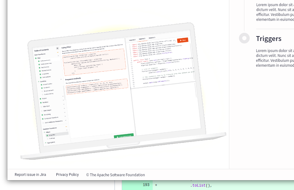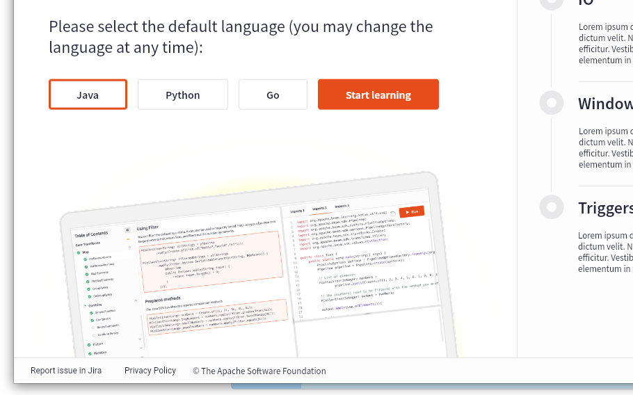 ########## learning/tour-of-beam/frontend/lib/pages/welcome/screen.dart: ########## @@ -0,0 +1,348 @@ +/* + * Licensed to the Apache Software Foundation (ASF) under one + * or more contributor license agreements. See the NOTICE file + * distributed with this work for additional information + * regarding copyright ownership. The ASF licenses this file + * to you under the Apache License, Version 2.0 (the + * "License"); you may not use this file except in compliance + * with the License. You may obtain a copy of the License at + * + * http://www.apache.org/licenses/LICENSE-2.0 + * + * Unless required by applicable law or agreed to in writing, software + * distributed under the License is distributed on an "AS IS" BASIS, + * WITHOUT WARRANTIES OR CONDITIONS OF ANY KIND, either express or implied. + * See the License for the specific language governing permissions and + * limitations under the License. + */ + +import 'package:easy_localization/easy_localization.dart'; +import 'package:flutter/gestures.dart'; +import 'package:flutter/material.dart'; +import 'package:flutter_svg/svg.dart'; + +import '../../components/complexity.dart'; +import '../../components/page_container.dart'; +import '../../config/theme/colors_provider.dart'; +import '../../constants/assets.dart'; +import '../../constants/colors.dart'; +import '../../constants/sizes.dart'; + +class WelcomeScreen extends StatelessWidget { + const WelcomeScreen(); + + @override + Widget build(BuildContext context) { + return PageContainer( + child: SingleChildScrollView( + child: Row( + crossAxisAlignment: CrossAxisAlignment.start, + children: const [ + Expanded(child: _SdkSelection()), + Expanded(child: _TourSummary()), + ], + ), + ), + ); + } +} + +class _SdkSelection extends StatelessWidget { + const _SdkSelection(); + + @override + Widget build(BuildContext context) { + return _SdkSelectionBody( + child: Column( + children: [ + Padding( + padding: const EdgeInsets.fromLTRB(50, 60, 50, 20), + child: Column( + crossAxisAlignment: CrossAxisAlignment.start, + children: const [ + _IntroText(), + SizedBox(height: TobSizes.size32), + _Buttons(), + ], + ), + ), + Image.asset(TobAssets.welcomeLaptop), Review Comment: Why do you want it removed? This image is in the approved layout: https://www.figma.com/file/gzeYx965q4DwV6ugDzp0iG/Apache-Beam-Playground?node-id=1475%3A5359 There is a problem with it however. It is cropped nicely on the mock, but looks awkward when scrolled down:  I suggest we keep it but stick to the bottom at the crop ratio from the mock so the user cannot scroll below this:  Also for some reason the border shows hard pixels, we should see how to get them smooth if we keep the image. -- This is an automated message from the Apache Git Service. To respond to the message, please log on to GitHub and use the URL above to go to the specific comment. To unsubscribe, e-mail: [email protected] For queries about this service, please contact Infrastructure at: [email protected]