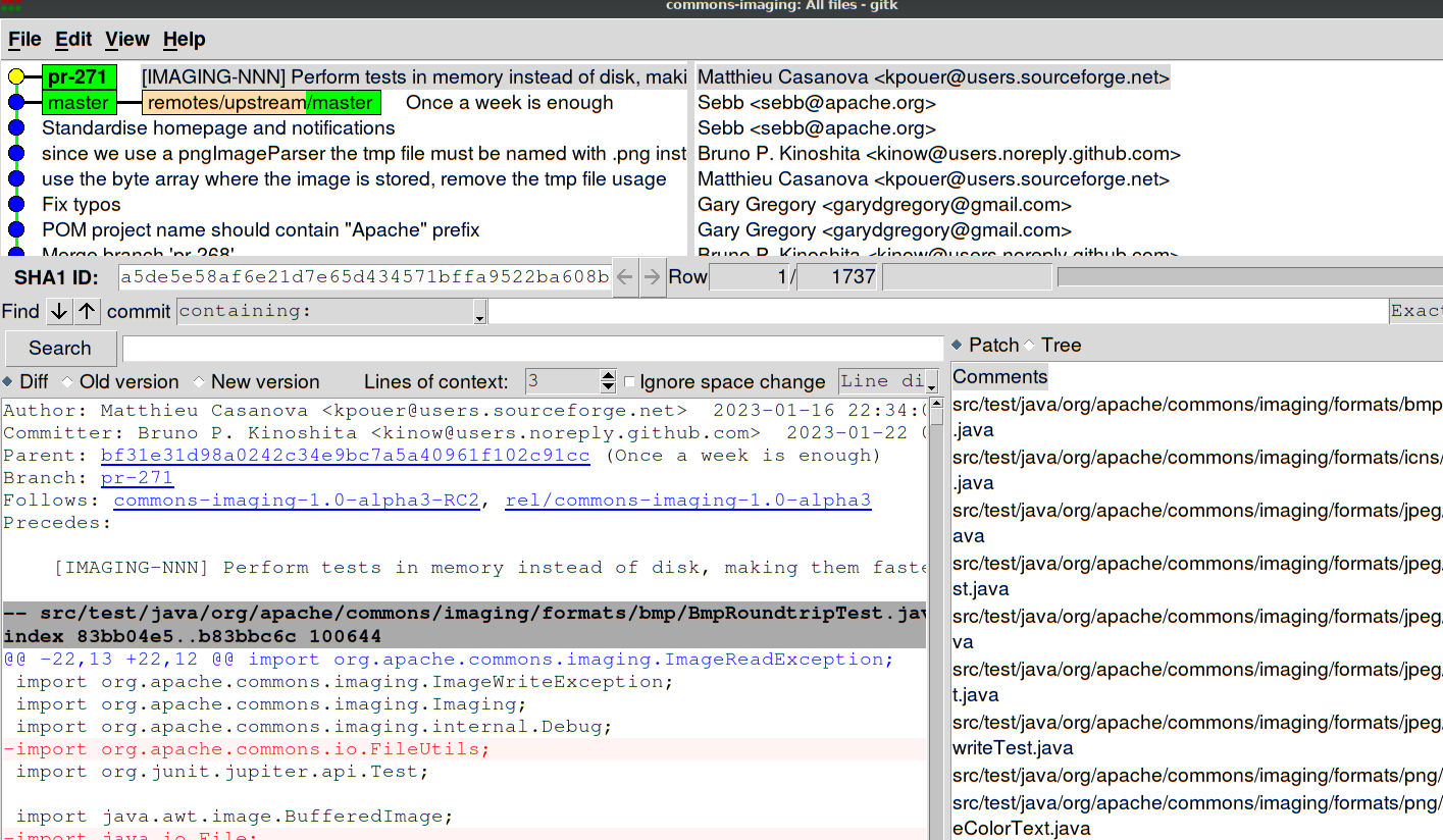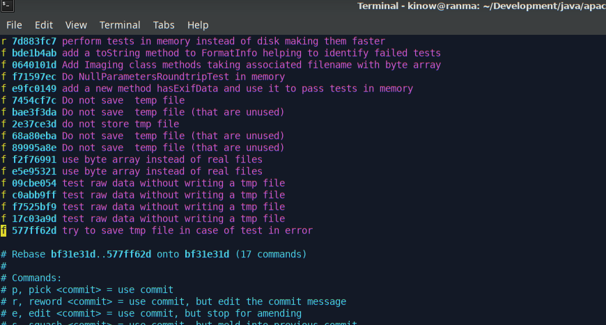 Hi @kpouer > Hey, I was not sure how I could squash commits without deleting my branch and pushing it again so I created a new branch and a new pull request (same code but squashed into one commit) #272 It's probably useful to get used to squashing commits, both for Apache Commons code contributions, but for other OSS that follow similar approach. The issue with opening new PR's is that a) you may have to add more commits again, and then squash again, and b) it gets more complicated to keep track of discussions and reviews (there's also c) where users/devs subscribed to the repo may get spammed by similar changes). If you'd like you can try on this PR, as it's still open: https://gitready.com/advanced/2009/02/10/squashing-commits-with-rebase.html I squash rebasing interactively. Basically what I'd do here would be something similar to: ```bash git fetch --all git rebase upstream/master # upstream for me is apache/commons-imaging, kinow for me is the kinow/commons-imaging gitk # or git log -n N, but I like to take a look at the GUI too, then count the number of commits since the top of master # you have 17 commits here, ATOW git rebase -i HEAD~17 # -i is interactive, i.e. I will interact with git to decide how to rebase # each commit is prefixed by an action code, I mark the first line as r-eword # and for each new commit line in the VIM/editor, I mark as f-ixup ```  When I save my editor, `git rebase` proceeds, opening the editor again as I asked to reword the fix commit. Now I write a good commit line. If I already have the JIRA number I prefix the commit message with [IMAGING-NNNN] Perform tests in memory instead of disk, making them faster". When I save this file again, git will use the text as the commit message of the reworded commit. The other commits have been all "fixed-up". So now everything has been "squashed" into a single commit. At this point I `gitk` again, or `git log -n 1` or `-n 2` to look at the commit history again.  At this point your local branch contains the squashed commits for your change. You can browse the code, run `mvn`, etc., until you are sure that everything is in order. Then you are ready to `push -f kinow/branch-name` (where kinow will be your personal remote, and branch-name must be `unit_test_tmp_fil....`, I think). And the pull request will have been updated with your forced (-f) commit, showing a single commit for reviewers :+1: If that works you can close your other PR. Or if you prefer to try this later, feel free to close this issue :+1: up to you. > I would be happy to create a JIRA ticket but I don't have an account on it. It says I could send an email to [[email protected]](mailto:[email protected]) if that email is setup. Is it ? I am sorry, due to bots SPAMing our JIRA server we had to lock it for new users :disappointed_relieved: Send the email, please, to the commons private mail (it's the email address you mentioned above, minus the "-imaging" part) with the info on https://infra.apache.org/jira-guidelines.html#account, and I or another committer will create your account. Really sorry for the inconvenience :bow: Thanks @kpouer ! -- This is an automated message from the Apache Git Service. To respond to the message, please log on to GitHub and use the URL above to go to the specific comment. To unsubscribe, e-mail: [email protected] For queries about this service, please contact Infrastructure at: [email protected]
