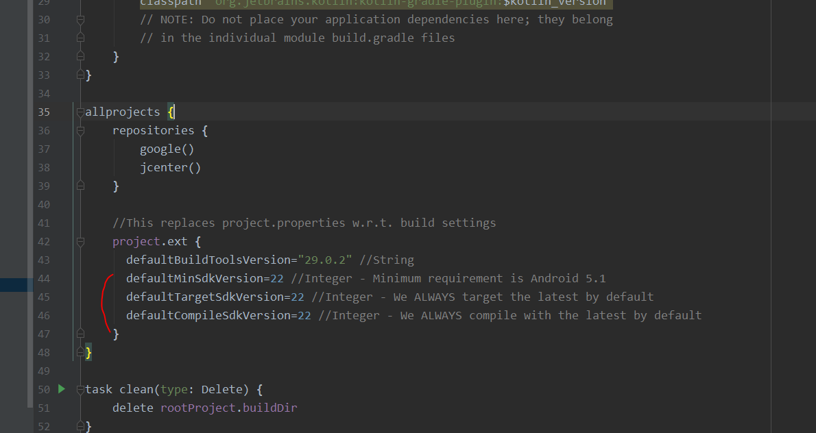 compile and run it with the defaultCompileSdkVersion starting from 22 and