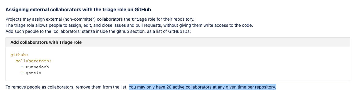 I got this email:  However, this looks to be inconsistent with the docs:  https://cwiki.apache.org/confluence/display/INFRA/Git+-+.asf.yaml+features Since I got committer rights a while ago, I can be removed from the list. -- This is an automated message from the Apache Git Service. To respond to the message, please log on to GitHub and use the URL above to go to the specific comment. To unsubscribe, e-mail: [email protected] For queries about this service, please contact Infrastructure at: [email protected] --------------------------------------------------------------------- To unsubscribe, e-mail: [email protected] For additional commands, e-mail: [email protected]