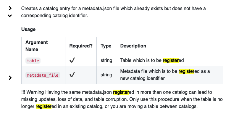 ########## docs/spark-procedures.md: ########## @@ -493,6 +493,38 @@ CALL spark_catalog.system.add_files( ) ``` +### `register_table` + +Creates a catalog entry for a metadata.json file which already exists but does not have a corresponding catalog identifier. + +#### Usage + +| Argument Name | Required? | Type | Description | +|---------------|-----------|------|-------------| +| `table` | ✔️ | string | Table which is to be registered | +| `metadata_file`| ✔️ | string | Metadata file which is to be registered as a new catalog identifier | + +!!! Warning +Having the same metadata.json registered in more than one catalog can lead to missing updates, loss of data, and table corruption. Only use this procedure when the table is no longer registered in an existing catalog, or you are moving a table between catalogs. Review Comment: This line needs to be indented to have the block work Please check all do changes after rendering the page to make sure it works To do so follow the directions here https://github.com/apache/iceberg-docs/tree/main Once I copied the files into the iceberg-docs repo I ran hugo in the docs directory to generate the html in the public dir  -- This is an automated message from the Apache Git Service. To respond to the message, please log on to GitHub and use the URL above to go to the specific comment. To unsubscribe, e-mail: [email protected] For queries about this service, please contact Infrastructure at: [email protected] --------------------------------------------------------------------- To unsubscribe, e-mail: [email protected] For additional commands, e-mail: [email protected]