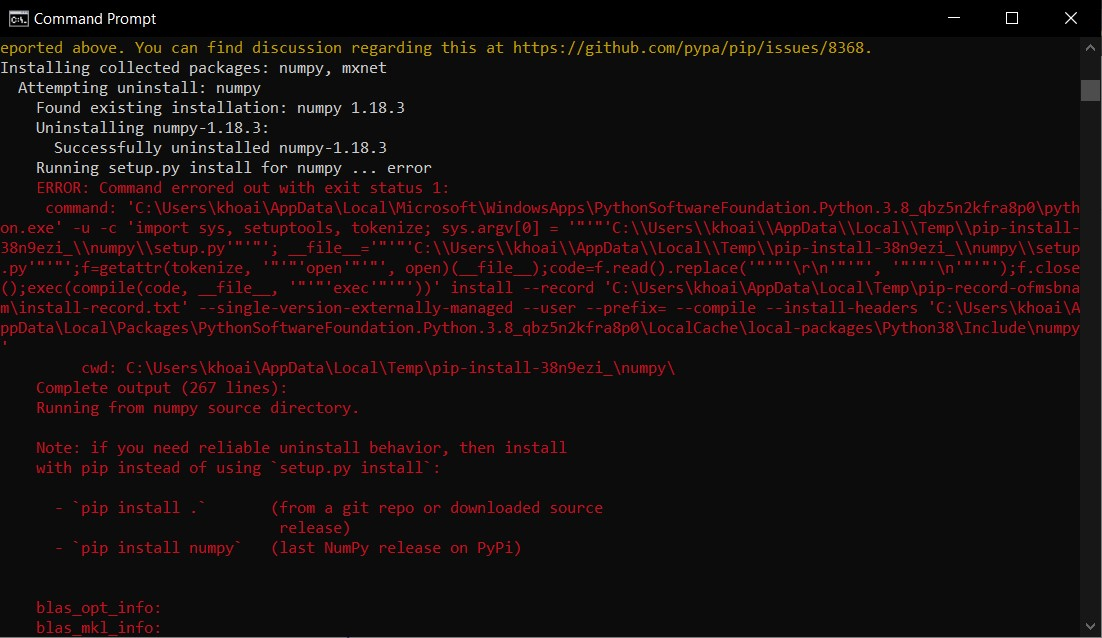 I can not use 'pip install mxnet' in command prompt to intstall mxnet. It keep appearing a list with long of issues that I hardly to know what it is . Here it is a small part of my issue  ---------------------------------------------------------------- This is an automated message from the Apache Git Service. To respond to the message, please log on to GitHub and use the URL above to go to the specific comment. For queries about this service, please contact Infrastructure at: [email protected] --------------------------------------------------------------------- To unsubscribe, e-mail: [email protected] For additional commands, e-mail: [email protected]