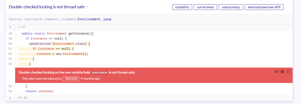 > I just found a Double-checked locking is not thread-safe error level alert on