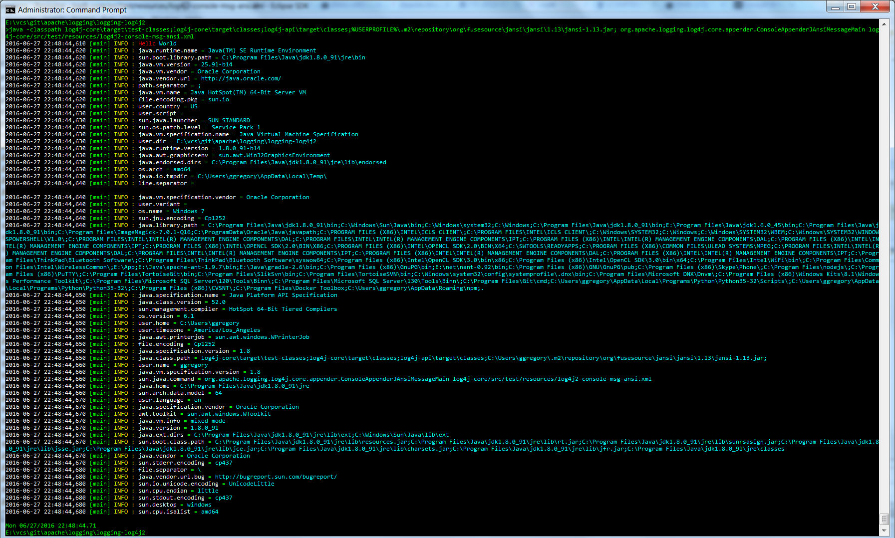 > That's very nice looking! > > Cheers, > Paul > > On Tue, Jun 28, 2016 at 1:03 AM, Gary Gregory <[email protected]> > wrote: > >> For fun: https://ibin.co/2mBev3ns9FJz.png >> >> Gary >> >> On Wed, Jun 15, 2016 at 10:50 PM, Gary Gregory <[email protected]> >> wrote: >> >>> Hi All, >>> >>> See color messages in Maven 3.4.0-SNAPSHOT made me think of the >>> following. >>> >>> Right now, with Jansi on the CP, I can say: >>> >>> import static org.fusesource.jansi.Ansi.*; >>> import static org.fusesource.jansi.Ansi.Color.*; >>> ... >>> logger.info(ansi().fg(RED).a("Hello").fg(CYAN).a(" World").reset()); >>> >>> and the right thing happens on the console. >>> >>> If I also have a file appender, I get the escape codes in the file, >>> which I do not think most people would want. >>> >>> The question is, how can we make it simple for users to have their cake >>> and eat it too? >>> >>> With a special Message implementation? >>> >>> Thoughts? >>> >>> Thank you, >>> Gary >>> -- >>> E-Mail: [email protected] | [email protected] >>> Java Persistence with Hibernate, Second Edition >>> <http://www.manning.com/bauer3/> >>> JUnit in Action, Second Edition <http://www.manning.com/tahchiev/> >>> Spring Batch in Action <http://www.manning.com/templier/> >>> Blog: http://garygregory.wordpress.com >>> Home: http://garygregory.com/ >>> Tweet! http://twitter.com/GaryGregory >>> >> >> >> >> -- >> E-Mail: [email protected] | [email protected] >> Java Persistence with Hibernate, Second Edition >> <http://www.manning.com/bauer3/> >> JUnit in Action, Second Edition <http://www.manning.com/tahchiev/> >> Spring Batch in Action <http://www.manning.com/templier/> >> Blog: http://garygregory.wordpress.com >> Home: http://garygregory.com/ >> Tweet! http://twitter.com/GaryGregory >> > > -- Matt Sicker <[email protected]>