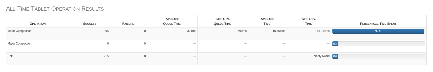 On a cluster that I have been running for about a day, the monitor is reporting that 0 major compactions have occurred in the tserver all time history. The Split stats are screwed up as well. See screenshot. **To Reproduce** 1. In the Monitor... Click Servers -> Tablet Servers 2. Click on the ip address link of a tserver 3. Look at the All-Time Tablet Operation Results table  ---------------------------------------------------------------- This is an automated message from the Apache Git Service. To respond to the message, please log on to GitHub and use the URL above to go to the specific comment. For queries about this service, please contact Infrastructure at: [email protected]