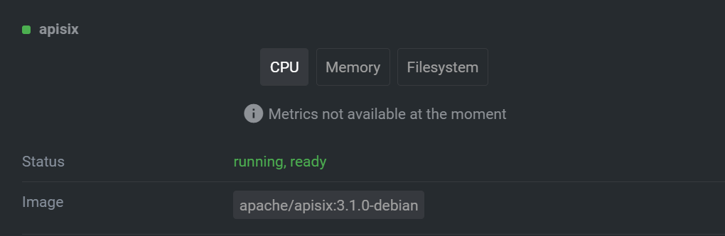 APISIX Version: apisix:3.1.0-debian  -- This is an automated message from the Apache Git Service. To respond to the message, please log on to GitHub and use the URL above to go to the specific comment. To unsubscribe, e-mail: [email protected] For queries about this service, please contact Infrastructure at: [email protected]