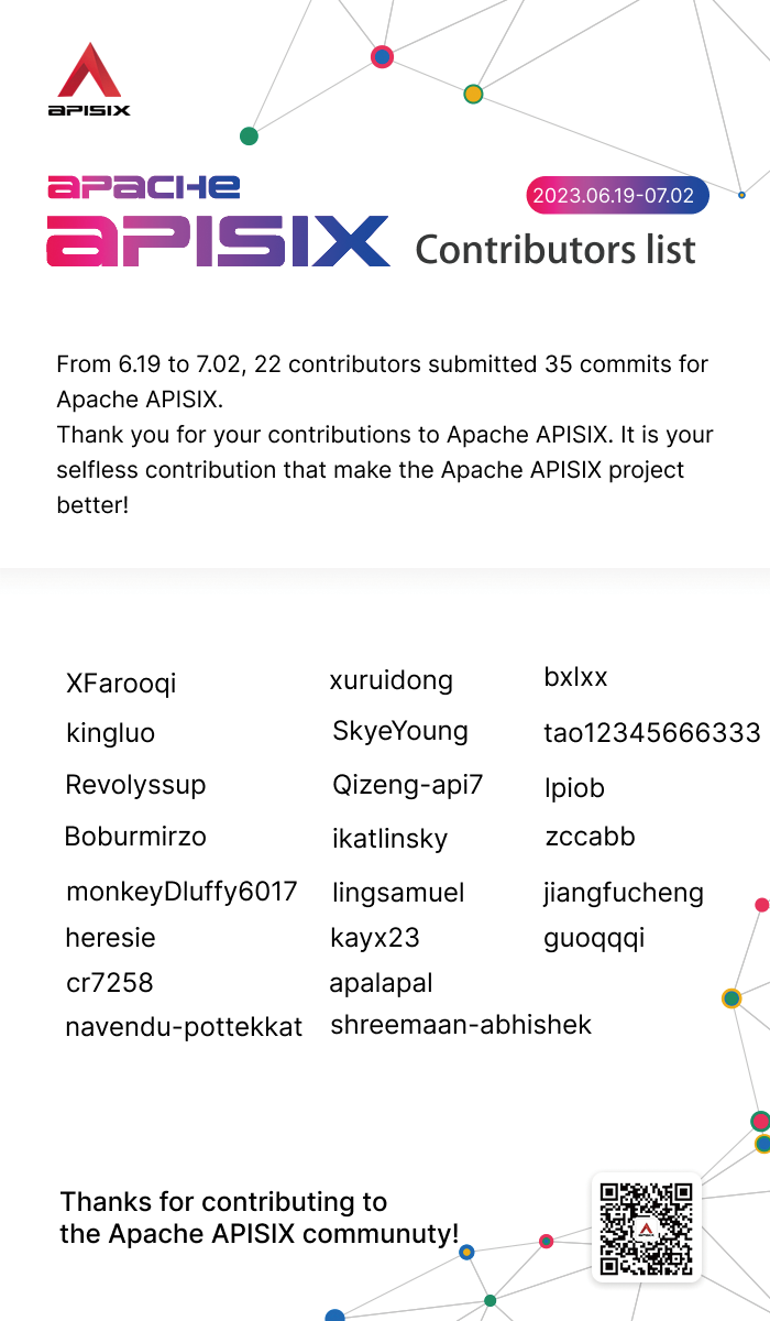 ########## blog/en/blog/2023/07/05/weekly-report.md: ########## @@ -0,0 +1,55 @@ +--- +title: "Biweekly Report (June 19 - July 05)" +keywords: +- Apache APISIX +- API Gateway +- Weekly Report +- Contributor +description: The Apache APISIX Community Biweekly Report can help community members better grasp the progress of the Apache APISIX community so that everyone can participate in the Apache APISIX community. +tags: [Community] +image: https://static.apiseven.com/uploads/2023/07/03/o1PFlwn0_%E7%A4%BE%E5%8C%BA%E5%8F%8C%E5%91%A8%E6%8A%A5-%E5%85%AC%E4%BC%97%E5%8F%B7%E5%A4%B4%E5%9B%BE-%E8%8B%B1%E6%96%87.png +--- + +> We have recently fixed and improved some features of Apache APISIX, please read this blog for details! + +<!--truncate--> + +## Introduction + +Apache APISIX grew up as a community from the first day it was open-sourced, and quickly became the most active open-source API gateway project in the world. These achievements are inseparable from the joint efforts of community partners. + +From 6.19 to 7.02, 22 contributors submitted 35 commits for Apache APISIX. Thank you for your contributions to Apache APISIX. + +We have recently fixed and improved some features, and the summary of the updates is as follows: + +1. APISIX now allows customizing Prometheus default bucket. + +2. Fixed the problem that `body-transformer` plugin cannot convert empty tables properly. + +3. Fixed the issue that `max_kept` configuration of the `log-rotate` plugin does not work when using a custom name. + +4. With recently added `annotation`, APISIX Ingress now allows rewriting of response headers. + +"If you want to go fast, go alone. If you want to go far, go together." The Apache APISIX Community Biweekly Report can help community members better grasp the progress of the Apache APISIX community so that everyone can participate in the Apache APISIX community. + +## Contributor Statistics + + + + + +## Highlights of Recent Features + +### Apache APISIX + +- [APISIX allows customizing prometheus default bucket](https://github.com/apache/apisix/pull/9673) (Contributor: [jiangfucheng](https://github.com/jiangfucheng)) + +- [Fix the problem that body-transformer plugin cannot convert empty tables properly](https://github.com/apache/apisix/pull/9669) (Contributor: [kingluo](https://github.com/kingluo)) + +- [Fix the issue that max_kept configuration of the log-rotate plugin does not work when using a custom name](https://github.com/apache/apisix/pull/9749) (Contributor: [monkeyDluffy6017](https://github.com/monkeyDluffy6017)) + +### Apache APISIX Ingress Review Comment: ```suggestion ### Apache APISIX Ingress Controller ``` ########## blog/zh/blog/2023/07/05/weekly-report.md: ########## @@ -0,0 +1,55 @@ +--- +title: "社区双周报 (6.19 - 7.02)" +keywords: +- Apache APISIX +- API 网关 +- 社区周报 +- 贡献者 +description: “独行者速,众行者远”。Apache APISIX 社区周报希望可以帮助社区小伙伴们更好地掌握 Apache APISIX 社区的进展,方便大家参与到 Apache APISIX 社区中来。 +tags: [Community] +image: https://static.apiseven.com/uploads/2023/07/03/eFGYTgLd_%E7%A4%BE%E5%8C%BA%E5%8F%8C%E5%91%A8%E6%8A%A5-%E5%85%AC%E4%BC%97%E5%8F%B7%E5%A4%B4%E5%9B%BE-%E4%B8%AD%E6%96%87.png +--- + +> 我们近期对 Apache APISIX 的部分功能进行了修复或改善,详情请阅读本期双周报。 + +<!--truncate--> + +## 导语 + +Apache APISIX 从开源第一天就以社区方式成长,迅速成为全世界最活跃的开源 API 网关项目。这些成就,离不开社区小伙伴们的共同奋斗。 + +从 2023.6.19 - 2023.7.02,有 22 位开发者为 Apache APISIX 提交了 35 个 commit。感谢这些小伙伴为 Apache APISIX 添砖加瓦,是你们的无私付出,让 Apache APISIX 项目变得更好! + +我们近期对部分功能进行了修复或改善,更新内容汇总如下: + +1. APISIX 允许自定义 Prometheus 默认 bucket。 + +2. 修复 `body-transformer` 插件无法正常转换空的 table 问题。 + +3. 修复使用自定义名称时 `log-rotate` 插件的 `max_kept` 配置无法生效问题。 + +4. APISIX Ingress 新增 `annotation` 允许重写 response header。 + +“独行者速,众行者远”。Apache APISIX 社区周报希望可以帮助社区小伙伴们更好地掌握 Apache APISIX 社区的进展,方便大家参与到 Apache APISIX 社区中来。 + +## 贡献者统计 + + + + + +## 近期亮点功能 + +### Apache APISIX + +- [APISIX 允许自定义 prometheus 默认 bucket](https://github.com/apache/apisix/pull/9673)(贡献者:[jiangfucheng](https://github.com/jiangfucheng)) + +- [修复 body-transformer 插件无法正常转换空的 table 问题](https://github.com/apache/apisix/pull/9669)(贡献者:[kingluo](https://github.com/kingluo)) + +- [修复使用自定义名称时 log-rotate 插件的 max_kept 配置无法生效问题](https://github.com/apache/apisix/pull/9749)(贡献者:[monkeyDluffy6017](https://github.com/monkeyDluffy6017)) + +### Apache APISIX Ingress Review Comment: ```suggestion ### Apache APISIX Ingress Controller ``` -- This is an automated message from the Apache Git Service. To respond to the message, please log on to GitHub and use the URL above to go to the specific comment. To unsubscribe, e-mail: [email protected] For queries about this service, please contact Infrastructure at: [email protected]
