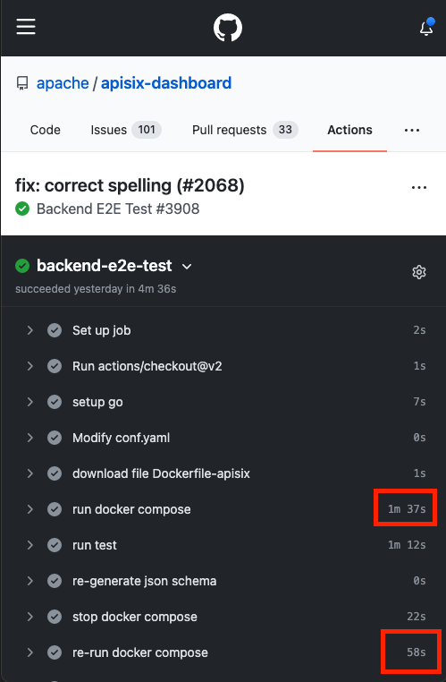 > It's nice to cache docker layers. Do you know how much time could we save with this @Yiyiyimu since CI is not completed for this PR, I can't tell exactly. but I think rebuilding docker every workflow is the main reason for slow CI. see   -- This is an automated message from the Apache Git Service. To respond to the message, please log on to GitHub and use the URL above to go to the specific comment. To unsubscribe, e-mail: [email protected] For queries about this service, please contact Infrastructure at: [email protected]