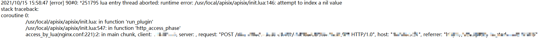 ### Issue description 我尝试自己开发了一个插件,运行在access阶段,配置好路由并开启此插件后,当同时触发调用几十次此路由(每次调用此路由时传递给后置接口的参数不同)会有少许几次请求报500错误,其他请求可正常执行插件并得到后置接口的响应,我尝试查看日志发现有报错,具体如下: 1.插件开发示例:  2.错误日志:  3.apisix源码定位:  麻烦给出一些建议或解决办法,感谢。 ### Environment - apisix version (cmd: `apisix version`): v2.8 - OS (cmd: `uname -a`): - OpenResty / Nginx version (cmd: `nginx -V` or `openresty -V`): - etcd version, if have (cmd: run `curl http://127.0.0.1:9090/v1/server_info` to get the info from server-info API): - apisix-dashboard version, if have: - the plugin runner version, if the issue is about a plugin runner (cmd: depended on the kind of runner): - luarocks version, if the issue is about installation (cmd: `luarocks --version`): ### Steps to reproduce 具体重现步骤这里不好清晰描述,可参考问题描述。 ### Actual result 实际结果是出现500响应错误。 ### Error log 错误日志如下:  ### Expected result _No response_ -- This is an automated message from the Apache Git Service. To respond to the message, please log on to GitHub and use the URL above to go to the specific comment. To unsubscribe, e-mail: [email protected] For queries about this service, please contact Infrastructure at: [email protected]