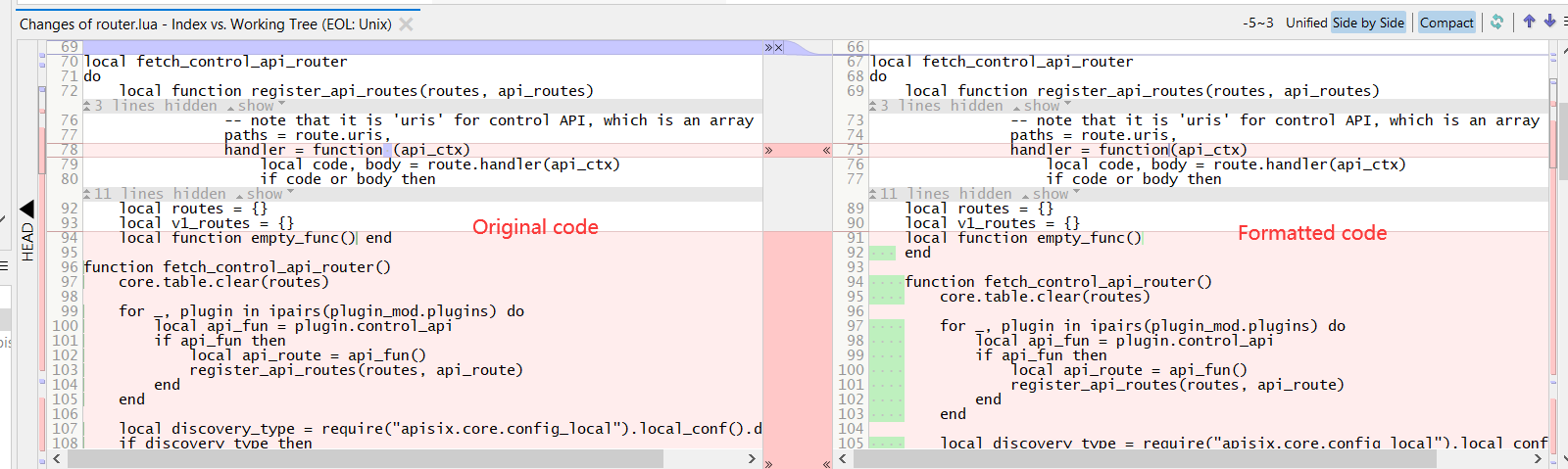 > Hi @spacewander , is there a recommended IDE and code formatter for formatting APISIX code? like a Lua plugin for VSCode or IntellJ IDEA? We tried the most popular Lua plugin in VSCode (from Tencent), but the formatted code has a lot of diff with original code. (we chose a random Lua file in APISIX and just format it directly). It makes us unable to format the code in our PR. We want a Lua formatter that is compatible with APISIX's coding format? > >  > >  Yes. We also tried LuaFormatter before, but it also format all the code instead of focussing a few places like adding space around the operator. So currently we have not found a suitable tool to do it automatically. -- This is an automated message from the Apache Git Service. To respond to the message, please log on to GitHub and use the URL above to go to the specific comment. To unsubscribe, e-mail: [email protected] For queries about this service, please contact Infrastructure at: [email protected]