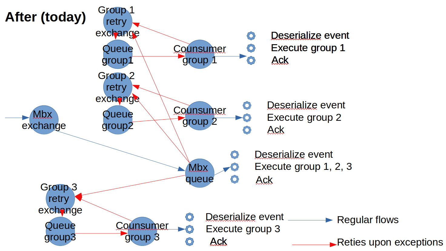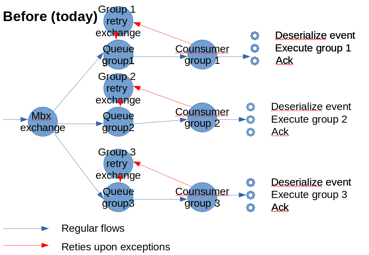 ## Why Every groups deserializes the event, which uses CPU and puts pressure on RabbitMQ.  We can likely mutualize group executions to minimize deserialization, acks, and reduce pressure on RabbitMQ. Note that we should try to preserve per-groups retries. ## How   ## Results - [ ] TODO RabbitMQ screenshot proving we decreased pressure on it. -- This is an automated message from the Apache Git Service. To respond to the message, please log on to GitHub and use the URL above to go to the specific comment. For queries about this service, please contact Infrastructure at: [email protected] --------------------------------------------------------------------- To unsubscribe, e-mail: [email protected] For additional commands, e-mail: [email protected]