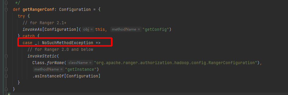 ### Code of Conduct - [X] I agree to follow this project's [Code of Conduct](https://www.apache.org/foundation/policies/conduct) ### Search before asking - [X] I have searched in the [issues](https://github.com/apache/kyuubi/issues?q=is%3Aissue) and found no similar issues. ### Describe the bug current environment: kyuubi authz version : master ranger version: 1.2.0 desc: When I use ranger version 1.2.0, kyuubi authz reports “RuntimeException: getConfig not in class org.apache.kyuubi.plugin.spark.authz.ranger.SparkRangerAdminPlugin" The reason is that the invoke method of AuthZUtils throws RuntimeException, and the getRangerConf method of RangerConfigProvider captures NoSuchMethodException, so it cannot enter the case branch.   ### Affects Version(s) master/1.6.0 ### Kyuubi Server Log Output _No response_ ### Kyuubi Engine Log Output ```logtalk java.lang.RuntimeException: getConfig not in class org.apache.kyuubi.plugin.spark.authz.ranger.SparkRangerAdminPlugin$ [getRangerConf,authorizeInSingleCall,useUserGroupsFromUserStoreEnabled,getFilterExpr,$anonfun$getFilterExpr$1$adapted,$anonfun$getFilterExpr$2,$anonfun$getFilterExpr$3$adapted,getMaskingExpr,$anonfun$getMaskingExpr$1$adapted,$anonfun$getMaskingExpr$2,$anonfun$verify$1$adapted,$anonfun$verify$2$adapted,$anonfun$verify$3$adapted,$anonfun$verify$5,$anonfun$getFilterExpr$1,$anonfun$getFilterExpr$3,$anonfun$getMaskingExpr$1,$anonfun$verify$1,$anonfun$verify$2,$anonfun$verify$4,$anonfun$verify$3,verify,getServiceType,evalRowFilterPolicies,evalDataMaskPolicies,isAccessAllowed,isAccessAllowed,isAccessAllowed,isAccessAllowed,getServicePluginMap,getAuditProvider,getClusterName,setClusterName,createRangerAuthContext,getCurrentRangerAuthContext,getServiceDef,getServiceDefId,getAuditProviderFactory,setPolicies,contextChanged,setResultProcessor,getResultProcessor,getResourceAcc essInfo,grantAccess,revokeAccess,registerAuthContextEventListener,unregisterAuthContextEventListener,createAdminClient,getDefaultServiceDef,logErrorMessage,getServiceName,getAppId,init,cleanup,wait,wait,wait,equals,toString,hashCode,getClass,notify,notifyAll] at org.apache.kyuubi.plugin.spark.authz.util.AuthZUtils$.invoke(AuthZUtils.scala:65) ~[kyuubi-spark-authz_2.12-1.7.0-SNAPSHOT.jar:1.7.0-SNAPSHOT] at org.apache.kyuubi.plugin.spark.authz.util.AuthZUtils$.invokeAs(AuthZUtils.scala:73) ~[kyuubi-spark-authz_2.12-1.7.0-SNAPSHOT.jar:1.7.0-SNAPSHOT] at org.apache.kyuubi.plugin.spark.authz.util.RangerConfigProvider.getRangerConf(RangerConfigProvider.scala:39) ~[kyuubi-spark-authz_2.12-1.7.0-SNAPSHOT.jar:1.7.0-SNAPSHOT] at org.apache.kyuubi.plugin.spark.authz.util.RangerConfigProvider.getRangerConf$(RangerConfigProvider.scala:36) ~[kyuubi-spark-authz_2.12-1.7.0-SNAPSHOT.jar:1.7.0-SNAPSHOT] at org.apache.kyuubi.plugin.spark.authz.ranger.SparkRangerAdminPlugin$.getRangerConf(SparkRangerAdminPlugin.scala:31) ~[kyuubi-spark-authz_2.12-1.7.0-SNAPSHOT.jar:1.7.0-SNAPSHOT] at org.apache.kyuubi.plugin.spark.authz.ranger.SparkRangerAdminPlugin$.useUserGroupsFromUserStoreEnabled(SparkRangerAdminPlugin.scala:59) ~[kyuubi-spark-authz_2.12-1.7.0-SNAPSHOT.jar:1.7.0-SNAPSHOT] at org.apache.kyuubi.plugin.spark.authz.ranger.AccessRequest$.getUserGroups(AccessRequest.scala:125) ~[kyuubi-spark-authz_2.12-1.7.0-SNAPSHOT.jar:1.7.0-SNAPSHOT] at org.apache.kyuubi.plugin.spark.authz.ranger.AccessRequest$.apply(AccessRequest.scala:48) ~[kyuubi-spark-authz_2.12-1.7.0-SNAPSHOT.jar:1.7.0-SNAPSHOT] at org.apache.kyuubi.plugin.spark.authz.ranger.RuleApplyRowFilterInfo.applyFilterAndMasking(RuleApplyRowFilterInfo.scala:64) ~[kyuubi-spark-authz_2.12-1.7.0-SNAPSHOT.jar:1.7.0-SNAPSHOT] at org.apache.kyuubi.plugin.spark.authz.ranger.RuleApplyRowFilterInfo.$anonfun$apply$2(RuleApplyRowFilterInfo.scala:52) ~[kyuubi-spark-authz_2.12-1.7.0-SNAPSHOT.jar:1.7.0-SNAPSHOT] at scala.Option.map(Option.scala:230) ~[scala-library-2.12.15.jar:?] at org.apache.kyuubi.plugin.spark.authz.ranger.RuleApplyRowFilterInfo.$anonfun$apply$1(RuleApplyRowFilterInfo.scala:52) ~[kyuubi-spark-authz_2.12-1.7.0-SNAPSHOT.jar:1.7.0-SNAPSHOT] at scala.collection.TraversableLike.$anonfun$map$1(TraversableLike.scala:286) ~[scala-library-2.12.15.jar:?] at scala.collection.Iterator.foreach(Iterator.scala:943) ~[scala-library-2.12.15.jar:?] at scala.collection.Iterator.foreach$(Iterator.scala:943) ~[scala-library-2.12.15.jar:?] at scala.collection.AbstractIterator.foreach(Iterator.scala:1431) ~[scala-library-2.12.15.jar:?] at scala.collection.IterableLike.foreach(IterableLike.scala:74) ~[scala-library-2.12.15.jar:?] at scala.collection.IterableLike.foreach$(IterableLike.scala:73) ~[scala-library-2.12.15.jar:?] at scala.collection.AbstractIterable.foreach(Iterable.scala:56) ~[scala-library-2.12.15.jar:?] at scala.collection.TraversableLike.map(TraversableLike.scala:286) ~[scala-library-2.12.15.jar:?] at scala.collection.TraversableLike.map$(TraversableLike.scala:279) ~[scala-library-2.12.15.jar:?] at scala.collection.AbstractTraversable.map(Traversable.scala:108) ~[scala-library-2.12.15.jar:?] at org.apache.kyuubi.plugin.spark.authz.ranger.RuleApplyRowFilterInfo.mapChildren(RuleApplyRowFilterInfo.scala:42) ~[kyuubi-spark-authz_2.12-1.7.0-SNAPSHOT.jar:1.7.0-SNAPSHOT] at org.apache.kyuubi.plugin.spark.authz.ranger.RuleApplyRowFilterInfo.apply(RuleApplyRowFilterInfo.scala:48) ~[kyuubi-spark-authz_2.12-1.7.0-SNAPSHOT.jar:1.7.0-SNAPSHOT] at org.apache.kyuubi.plugin.spark.authz.ranger.RuleApplyRowFilterInfo.$anonfun$apply$1(RuleApplyRowFilterInfo.scala:53) ~[kyuubi-spark-authz_2.12-1.7.0-SNAPSHOT.jar:1.7.0-SNAPSHOT Caused by: java.lang.NoSuchMethodException: org.apache.kyuubi.plugin.spark.authz.ranger.SparkRangerAdminPlugin$.getConfig() at java.lang.Class.getMethod(Class.java:1786) ~[?:1.8.0_201] at org.apache.kyuubi.plugin.spark.authz.util.AuthZUtils$.invoke(AuthZUtils.scala:59) ~[kyuubi-spark-authz_2.12-1.7.0-SNAPSHOT.jar:1.7.0-SNAPSHOT] ``` ### Kyuubi Server Configurations _No response_ ### Kyuubi Engine Configurations _No response_ ### Additional co