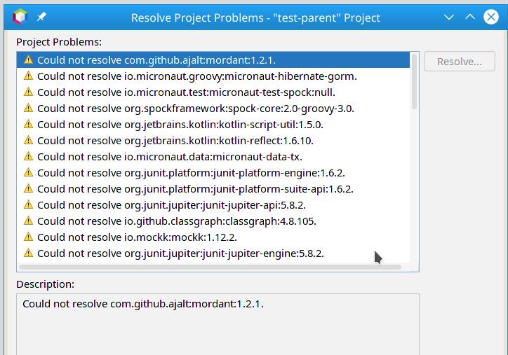 When loading more complex projects like [`micronaut-test`](https://github.com/micronaut-projects/micronaut-test), NetBeans IDE reports a number of 'unresolvable artifact' errors:  Indeed, even the commandline gradle produces them: ``` testCodeCoverageReportExecutionData - Supplies JaCoCo coverage data to the testCodeCoverageReport. External library dependencies may appear as resolution failures, but this is expected behavior. +--- project :test-core | +--- io.micronaut:micronaut-inject FAILED | +--- io.micronaut:micronaut-runtime FAILED | +--- io.micronaut:micronaut-bom:3.3.4 ``` ... but note the comment at the top of the configuration. We can exclude configurations from loading entirely, but it seems that the 'unresolvable' problems appear in either hidden (not visible) or otherwise poorly usable (!canBeConsumed) configurations. So I've disabled unresolvable artifact reporting in this case. In addition, in the project `test-kotest`, the IDE complained that a property `getFreeCompilerArgs` is not present at `JvmKotlinOptions` - that's caused by using the getter method name instead of property name in the call to `getProperty`. -- This is an automated message from the Apache Git Service. To respond to the message, please log on to GitHub and use the URL above to go to the specific comment. To unsubscribe, e-mail: [email protected] For queries about this service, please contact Infrastructure at: [email protected] --------------------------------------------------------------------- To unsubscribe, e-mail: [email protected] For additional commands, e-mail: [email protected] For further information about the NetBeans mailing lists, visit: https://cwiki.apache.org/confluence/display/NETBEANS/Mailing+lists