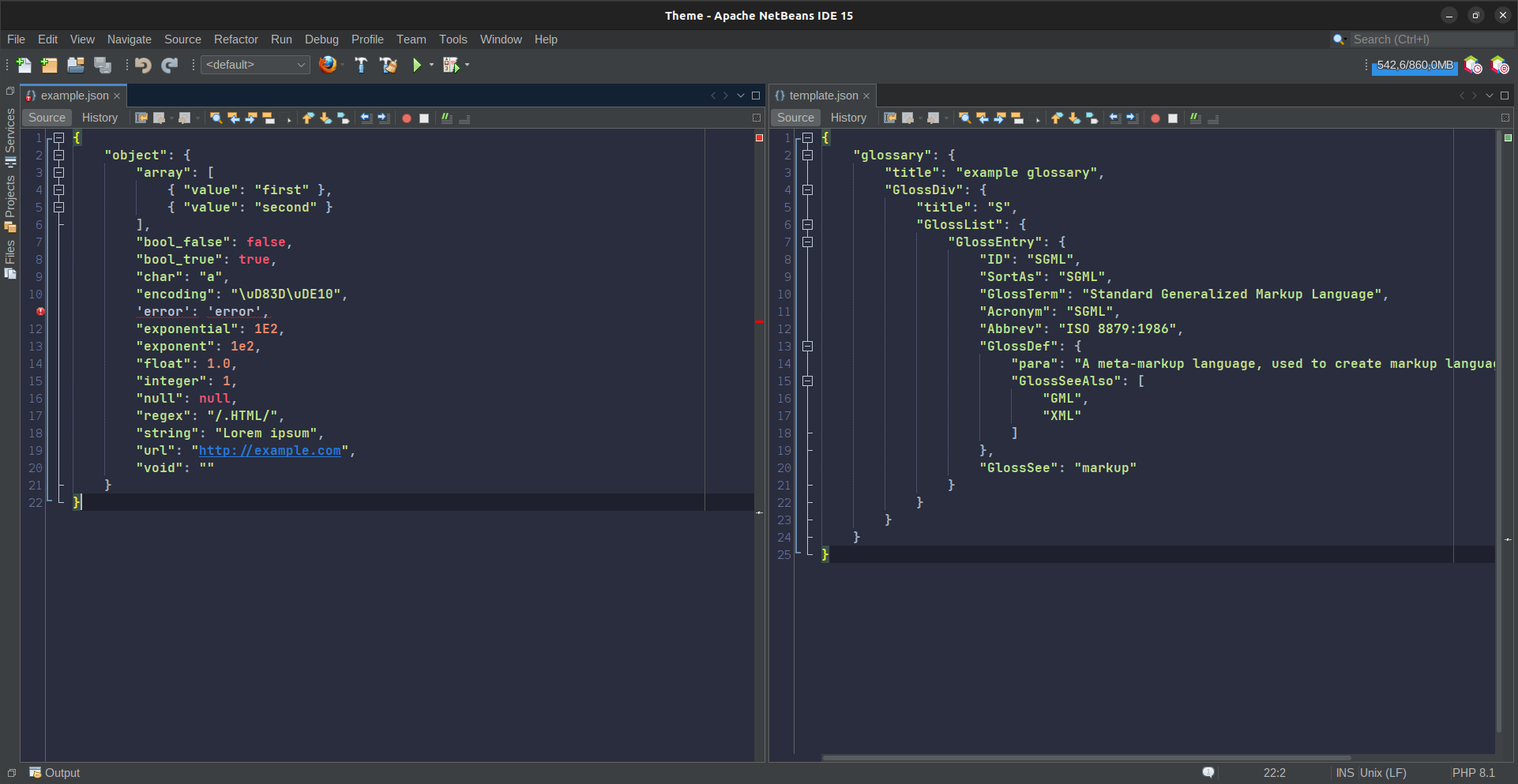 ### Description More complete example of JSON file for syntax highlighting ### Use case/motivation The example JSON file for syntax highlighting is the one provided by the [json.org](https://json.org/example.html) site. This example only contains strings, object and array. ```json { "glossary": { "title": "example glossary", "GlossDiv": { "title": "S", "GlossList": { "GlossEntry": { "ID": "SGML", "SortAs": "SGML", "GlossTerm": "Standard Generalized Markup Language", "Acronym": "SGML", "Abbrev": "ISO 8879:1986", "GlossDef": { "para": "A meta-markup language, used to create markup languages such as DocBook.", "GlossSeeAlso": [ "GML", "XML" ] }, "GlossSee": "markup" } } } } } ``` This is not enough to set syntax highlighting Can you provide a more complete example like this: ```json { "object": { "array": [ { "value": "first" }, { "value": "second" } ], "bool_false": false, "bool_true": true, "char": "a", "encoding": "\uD83D\uDE10", 'error': 'error', "exponential": 1E2, "exponent": 1e2, "float": 1.0, "integer": 1, "null": null, "regex": "/.HTML/", "string": "Lorem ipsum", "url": "http://example.com", "void": "" } } ``` Expected result:  ### Related issues _No response_ ### Are you willing to submit a pull request? No ### Code of Conduct Yes -- This is an automated message from the Apache Git Service. To respond to the message, please log on to GitHub and use the URL above to go to the specific comment. To unsubscribe, e-mail: [email protected] For queries about this service, please contact Infrastructure at: [email protected] --------------------------------------------------------------------- To unsubscribe, e-mail: [email protected] For additional commands, e-mail: [email protected] For further information about the NetBeans mailing lists, visit: https://cwiki.apache.org/confluence/display/NETBEANS/Mailing+lists