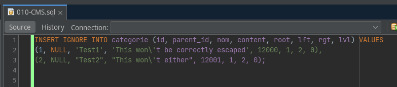 ### Apache NetBeans version Apache NetBeans 16 ### What happened Backslash escaping is not detected by the color highlighting in SQL Files :  I figure this is a bug because SQL does not produces any error when parsing these files, meaning these are acceptable ways of escaping SQL queries, which is not reflected correctly by the color highlighting ### How to reproduce Write this SQL il any .sql file open in NetBeans and see the code color break : ```sql INSERT IGNORE INTO categorie (id, parent_id, nom, content, root, lft, rgt, lvl) VALUES (1, NULL, 'Test1', 'This won\'t be correctly escaped', 12000, 1, 2, 0), (2, NULL, "Test2", "This won\'t either", 12001, 1, 2, 0); ``` ### Did this work correctly in an earlier version? No / Don't know ### Operating System Ubuntu 22.10 ### JDK OpenJDK 17 ### Apache NetBeans packaging Apache NetBeans provided installer ### Anything else _No response_ ### Are you willing to submit a pull request? No ### Code of Conduct Yes -- This is an automated message from the Apache Git Service. To respond to the message, please log on to GitHub and use the URL above to go to the specific comment. To unsubscribe, e-mail: [email protected] For queries about this service, please contact Infrastructure at: [email protected] --------------------------------------------------------------------- To unsubscribe, e-mail: [email protected] For additional commands, e-mail: [email protected] For further information about the NetBeans mailing lists, visit: https://cwiki.apache.org/confluence/display/NETBEANS/Mailing+lists