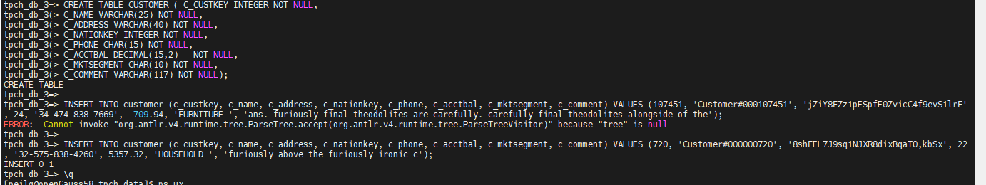 > I was using [c359608](https://github.com/apache/shardingsphere/commit/c3596089f4bfccd5d2b02b164c203f72e5d779be). > > I found the second insert didn't work neither. > >  > > ``` > [INFO ] 2022-09-24 11:01:00.756 [Connection-1-ThreadExecutor] ShardingSphere-SQL - Logic SQL: INSERT INTO customer (c_custkey, c_name, c_address, c_nationkey, c_phone, c_acctbal, c_mktsegment, c_comment) VALUES (720, 'Customer#000000720', '8shFEL7J9sq1NJXR8dixBqaTO,kbSx', 22, '32-575-838-4260', 5357.32, 'HOUSEHOLD ', 'furiously above the furiously ironic c'); > [INFO ] 2022-09-24 11:01:00.757 [Connection-1-ThreadExecutor] ShardingSphere-SQL - SQLStatement: OpenGaussInsertStatement(super=InsertStatement(super=AbstractSQLStatement(parameterCount=0, parameterMarkerSegments=[], commentSegments=[]), table=SimpleTableSegment(tableName=TableNameSegment(startIndex=12, stopIndex=19, identifier=IdentifierValue(value=customer, quoteCharacter=NONE)), owner=Optional.empty, alias=Optional.empty), insertColumns=Optional[InsertColumnsSegment(startIndex=21, stopIndex=108, columns=[ColumnSegment(startIndex=22, stopIndex=30, identifier=IdentifierValue(value=c_custkey, quoteCharacter=NONE), owner=Optional.empty), ColumnSegment(startIndex=33, stopIndex=38, identifier=IdentifierValue(value=c_name, quoteCharacter=NONE), owner=Optional.empty), ColumnSegment(startIndex=41, stopIndex=49, identifier=IdentifierValue(value=c_address, quoteCharacter=NONE), owner=Optional.empty), ColumnSegment(startIndex=52, stopIndex=62, identifier=IdentifierValue(value=c_nationkey , quoteCharacter=NONE), owner=Optional.empty), ColumnSegment(startIndex=65, stopIndex=71, identifier=IdentifierValue(value=c_phone, quoteCharacter=NONE), owner=Optional.empty), ColumnSegment(startIndex=74, stopIndex=82, identifier=IdentifierValue(value=c_acctbal, quoteCharacter=NONE), owner=Optional.empty), ColumnSegment(startIndex=85, stopIndex=96, identifier=IdentifierValue(value=c_mktsegment, quoteCharacter=NONE), owner=Optional.empty), ColumnSegment(startIndex=99, stopIndex=107, identifier=IdentifierValue(value=c_comment, quoteCharacter=NONE), owner=Optional.empty)])], insertSelect=Optional.empty, values=[InsertValuesSegment(startIndex=117, stopIndex=265, values=[LiteralExpressionSegment(startIndex=118, stopIndex=120, literals=720), LiteralExpressionSegment(startIndex=123, stopIndex=142, literals=Customer#000000720), LiteralExpressionSegment(startIndex=145, stopIndex=176, literals=8shFEL7J9sq1NJXR8dixBqaTO,kbSx), LiteralExpressionSegment(startIndex=179, stopIndex=180, literals=2 2), LiteralExpressionSegment(startIndex=183, stopIndex=199, literals=32-575-838-4260), LiteralExpressionSegment(startIndex=202, stopIndex=208, literals=5357.32), LiteralExpressionSegment(startIndex=211, stopIndex=222, literals=HOUSEHOLD ), LiteralExpressionSegment(startIndex=225, stopIndex=264, literals=furiously above the furiously ironic c)])]), withSegment=Optional.empty, onDuplicateKeyColumnsSegment=null) > [INFO ] 2022-09-24 11:01:00.757 [Connection-1-ThreadExecutor] ShardingSphere-SQL - Actual SQL: ds_0 ::: INSERT INTO customer (c_custkey, c_name, c_address, c_nationkey, c_phone, c_acctbal, c_mktsegment, c_comment) VALUES org.apache.shardingsphere.sharding.rewrite.token.pojo.ShardingInsertValuesToken@c4408a3; > ```  -- This is an automated message from the Apache Git Service. To respond to the message, please log on to GitHub and use the URL above to go to the specific comment. To unsubscribe, e-mail: [email protected] For queries about this service, please contact Infrastructure at: [email protected]