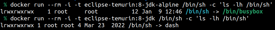 % docker run --rm -i -t eclipse-temurin:8-jdk /bin/sh -c 'ls -lh /bin/sh'