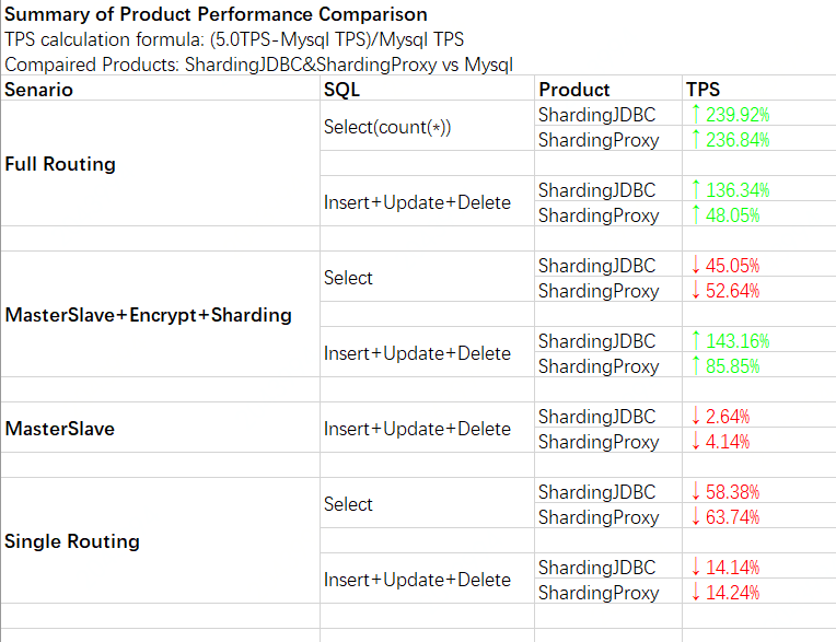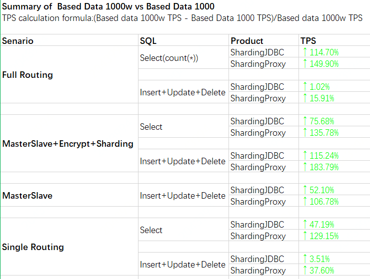 Recently i have been investigating ShardingProxy and ShardingJDBC performance. Senarios i did - Base Data 1000w vs Base Data 1000, observe tps of ShardingDBC & ShardingProxy; - With base data 1000w, comparing ShardingJDBC&ShardingProxy to Mysql, observe tps of ShardingDBC & ShardingProxy and Mysql; Result i got - At senario 1 - base data 1000w vs base data 1000, ShardingDBC & ShardingProxy tps improves a lot with base data 1000w, refer to image 1 as detail data ; - At senario 2 - with base data 1000w, comparing ShardingJDBC&ShardingProxy to Mysql, their tps is much better for full routing select/full routing insert+update+delete/masterslave+encrpytinsert+update+delete than mysql. In addition their tps is lower than Mysql, refer to image 2 as detail data ;   ---------------------------------------------------------------- This is an automated message from the Apache Git Service. To respond to the message, please log on to GitHub and use the URL above to go to the specific comment. For queries about this service, please contact Infrastructure at: [email protected]