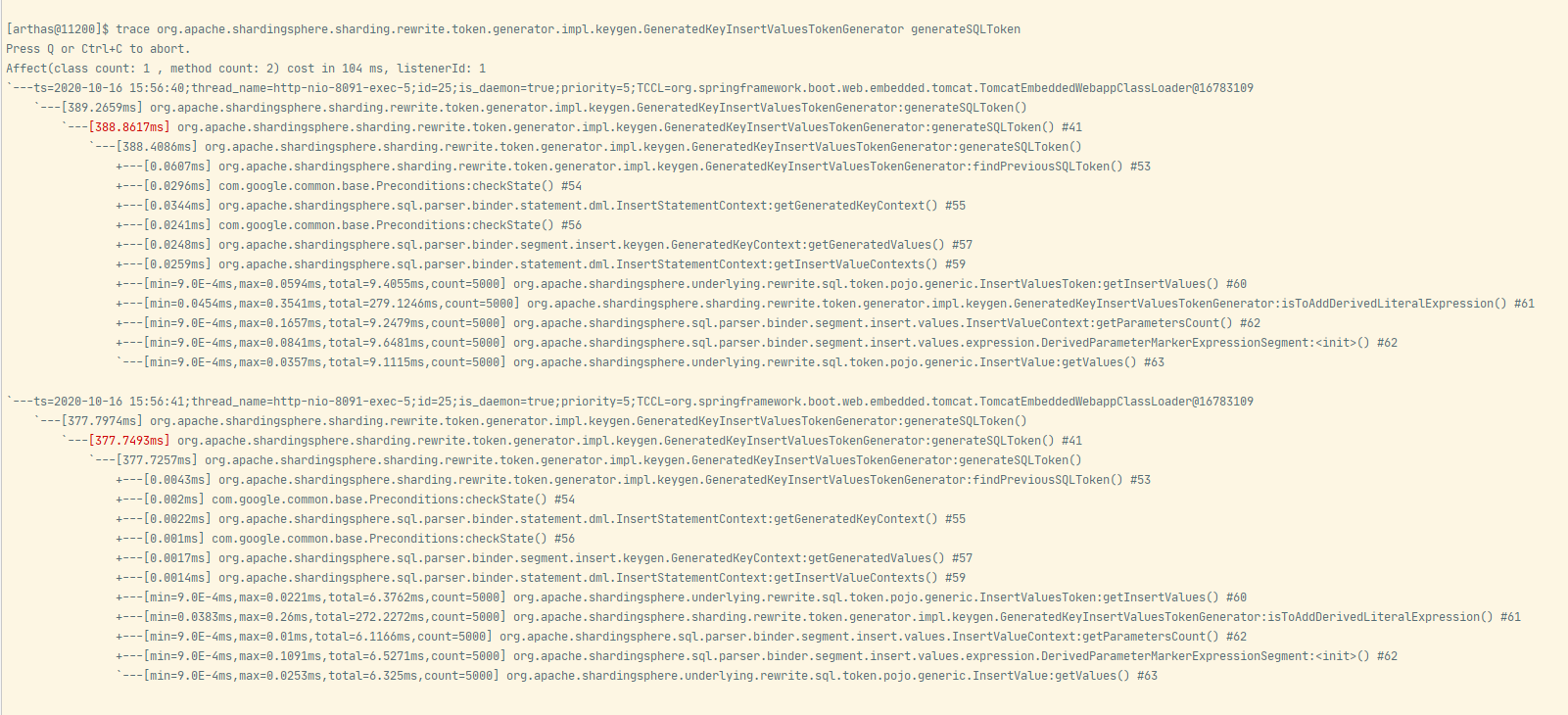 **My version** : Sharding-JDBC 4.1.1 sql like this: insert into pressure(userid,orderid) values(?, ?),(?,?),... insert data size is 5000, and i've used prepare statement. when NOT using sharding, time consumes about 40ms, but sharding takes about 400ms. Sharding tables configuration:  Analysis by arthas, I can see that time mostly cost on function `org.apache.shardingsphere.sharding.rewrite.token.generator.impl.keygen.GeneratedKeyInsertValuesTokenGenerator:isToAddDerivedLiteralExpression`. See below:  Is there anything I can do to improve efficiency? ---------------------------------------------------------------- This is an automated message from the Apache Git Service. To respond to the message, please log on to GitHub and use the URL above to go to the specific comment. For queries about this service, please contact Infrastructure at: [email protected]