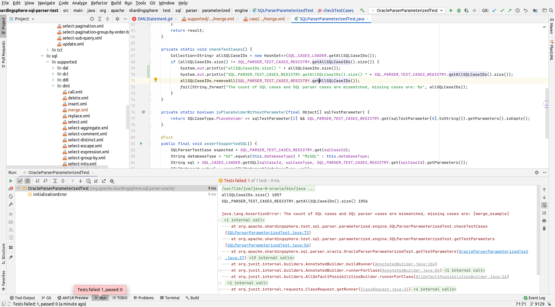 Hi @tristaZero, The count of SQL cases and SQL parser cases are mismatched when I try to run `OracleParserParameterizedTest`. I tried to write a basic one to ensure all okay but it's not considering my new case which is written inside `merge.xml`. Are there any configurations we need to do here? I've attached the error for your consideration.  ---------------------------------------------------------------- This is an automated message from the Apache Git Service. To respond to the message, please log on to GitHub and use the URL above to go to the specific comment. For queries about this service, please contact Infrastructure at: [email protected]