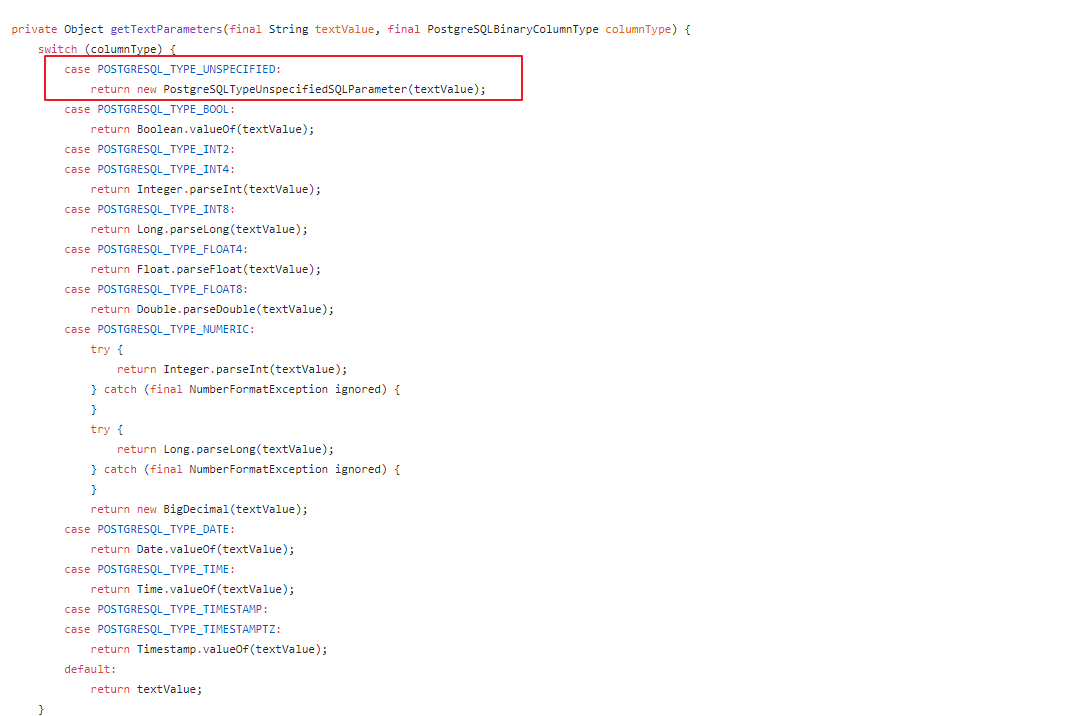 thank you for your reply I checked on the latest marst branch,And no further processing When typeOID is equal to 0, GetTextParameters in [PostgreSQLComBindPacket](https://github.com/apache/shardingsphere/blob/master/shardingsphere-db-protocol/shardingsphere-db-protocol-postgresql/src/main/java/org/apache/shardingsphere/db/protocol/postgresql/packet/command/query/binary/bind/PostgreSQLComBindPacket.java) Will enter POSTGRESQL_TYPE_UNSPECIFIED,  The result is still the same -- This is an automated message from the Apache Git Service. To respond to the message, please log on to GitHub and use the URL above to go to the specific comment. To unsubscribe, e-mail: [email protected] For queries about this service, please contact Infrastructure at: [email protected]