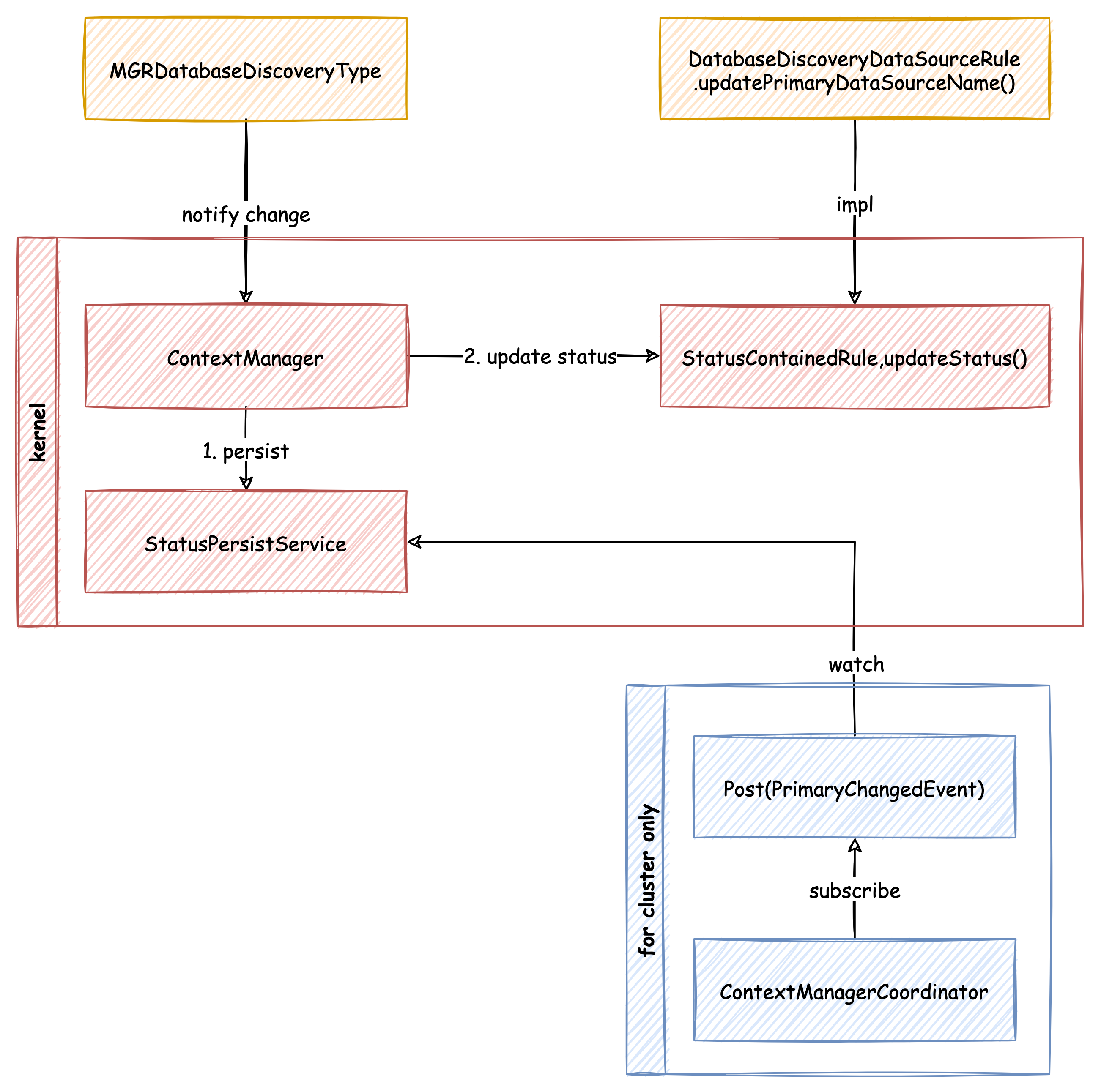 It is better to extract `StatusPersistService` as normal service, not for cluster mode only:  So, the tasks are changed to: - [X] Split ContextManagerBuilder for build one time only and put renew into coordinator; - [ ] Add StatusPersistService interface - [ ] Adjust refresh logic via diagram -- This is an automated message from the Apache Git Service. To respond to the message, please log on to GitHub and use the URL above to go to the specific comment. To unsubscribe, e-mail: [email protected] For queries about this service, please contact Infrastructure at: [email protected]