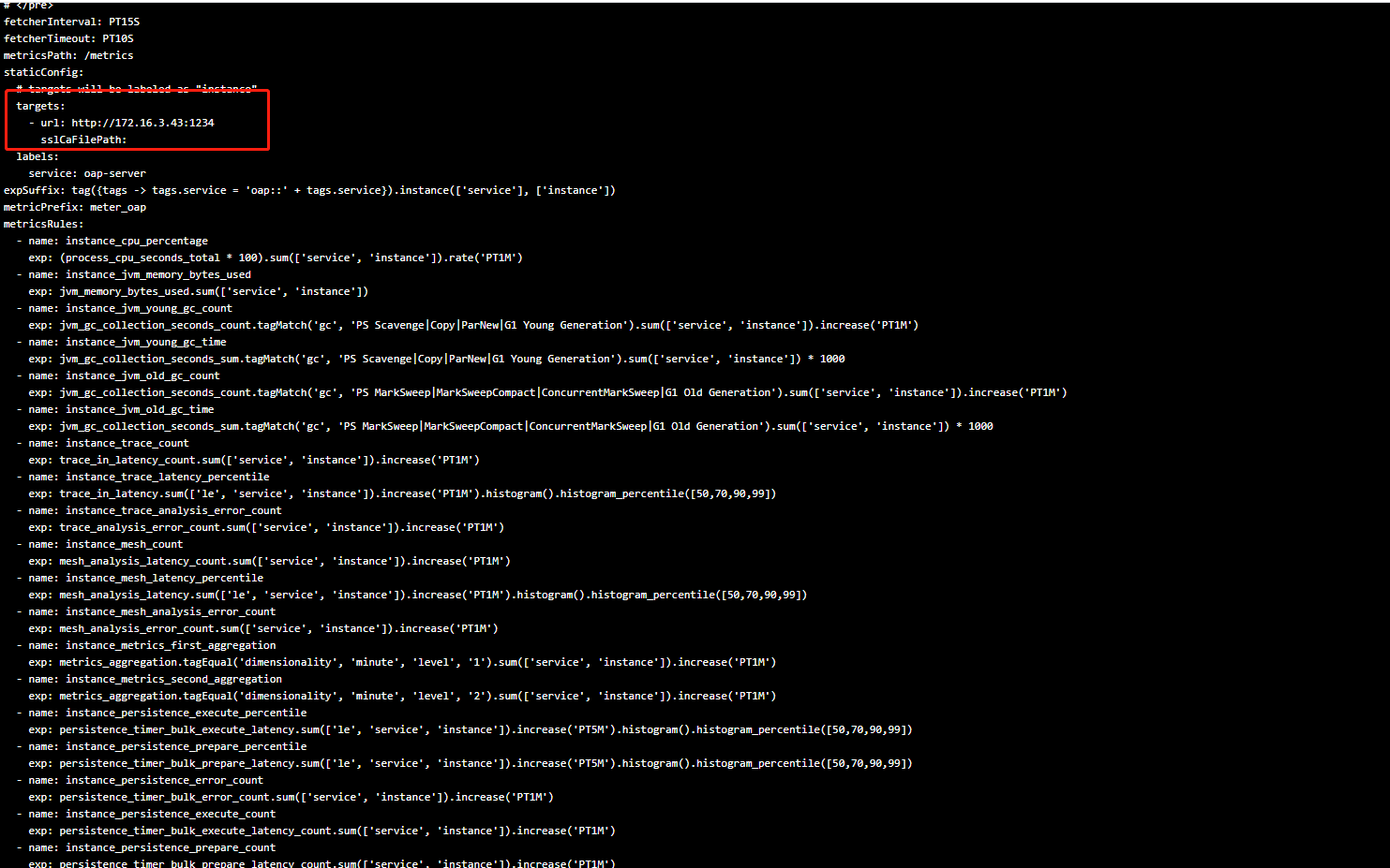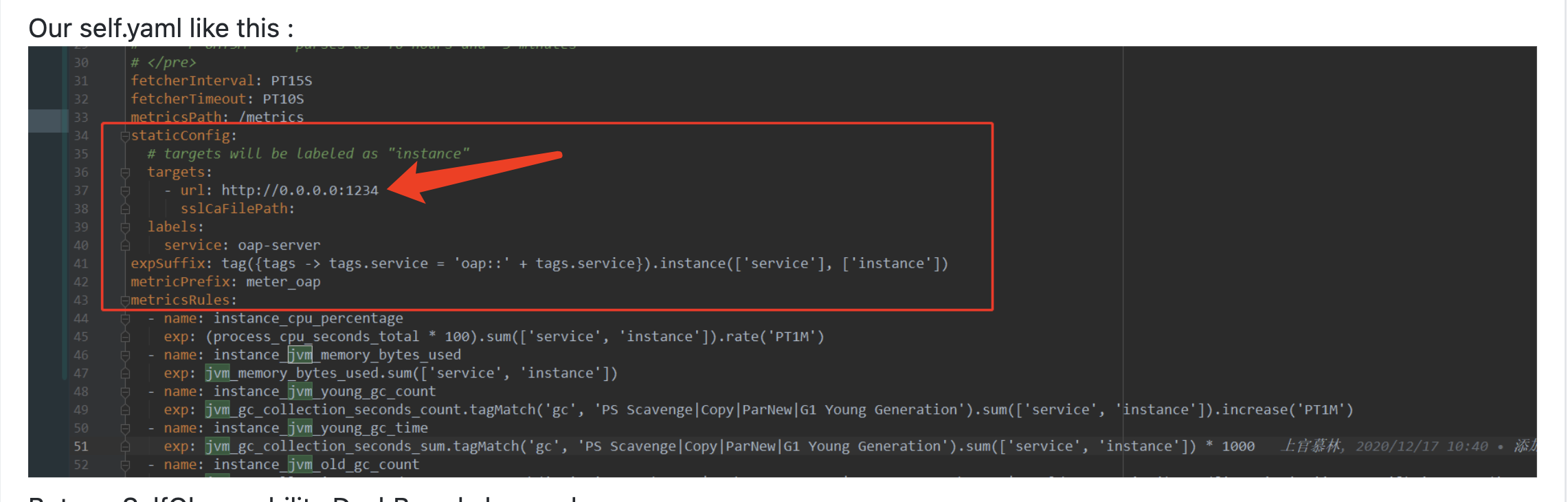 >  > @ZhouZiHe `self.yaml` looks like `0.0.0.0:1234`, please confirm >  > @ZhouZiHe `self.yaml` looks like `0.0.0.0:1234`, please confirm there is no problem this is our develop config when we use online config is this :  ---------------------------------------------------------------- This is an automated message from the Apache Git Service. To respond to the message, please log on to GitHub and use the URL above to go to the specific comment. For queries about this service, please contact Infrastructure at: [email protected]