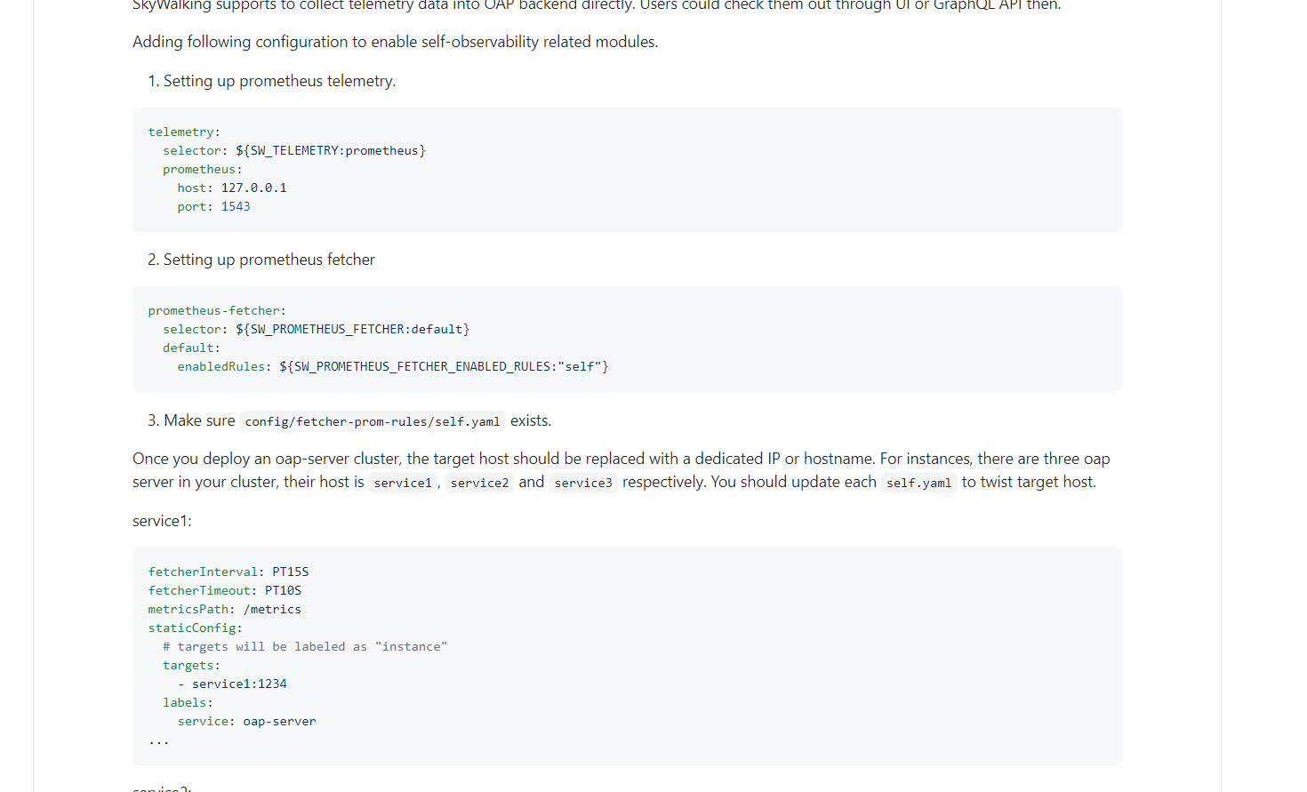 > ```yaml > version: '3.8' > services: > oap: > image: apache/skywalking-oap-server:8.3.0-es7 > container_name: oap > restart: always > ports: > - 12800:12800 > healthcheck: > test: ["CMD-SHELL", "/skywalking/bin/swctl ch"] > interval: 30s > timeout: 10s > retries: 3 > start_period: 40s > environment: > SW_STORAGE: h2 > SW_HEALTH_CHECKER: default > SW_TELEMETRY: prometheus > SW_PROMETHEUS_FETCHER: default > ui: > image: apache/skywalking-ui:8.3.0 > container_name: ui > depends_on: > - oap > links: > - oap > restart: always > ports: > - 8080:8080 > environment: > SW_OAP_ADDRESS: oap:12800 > ``` > >  > > @ZhouZiHe Did you set the`prometheus-fetcher? https://github.com/apache/skywalking/blob/master/docs/en/setup/backend/backend-telemetry.md#self-observability **We have already change the config as doc say**  **This is our new config below :**    **But it didn't seem to work** @arugal  And we can not get any data by using metrics interface :  ---------------------------------------------------------------- This is an automated message from the Apache Git Service. To respond to the message, please log on to GitHub and use the URL above to go to the specific comment. For queries about this service, please contact Infrastructure at: [email protected]