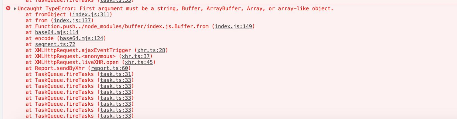 I saw the new feature of ClientJS-0.3.0 according to the test example provided by the running official [(skywalking-client-test),](https://github.com/SkyAPMTest/skywalking-client-test) but after we introduced ClientJS-0.3.0 to our company's front-end project, we kept reporting errors, and would not automatically send HTTP requests (**v3/segments**). Before, ClientJS-0.2.0 did not report errors, our project was the framework of React, and the error message was :**Uncaught TypeError:First argument must be a string, Buffer, Array, or array-like object.**  Here's the code we added: `import ClientMonitor from "skywalking-client-js";` `ClientMonitor.register({` `The collector: "/cfv2",` `Service: "cfv2-UI",` `ServiceVersion: "1.0.0".` `PagePath: "test.html",` `UseFmp: true,` `DetailMode: true` `});` ---------------------------------------------------------------- This is an automated message from the Apache Git Service. To respond to the message, please log on to GitHub and use the URL above to go to the specific comment. For queries about this service, please contact Infrastructure at: [email protected]