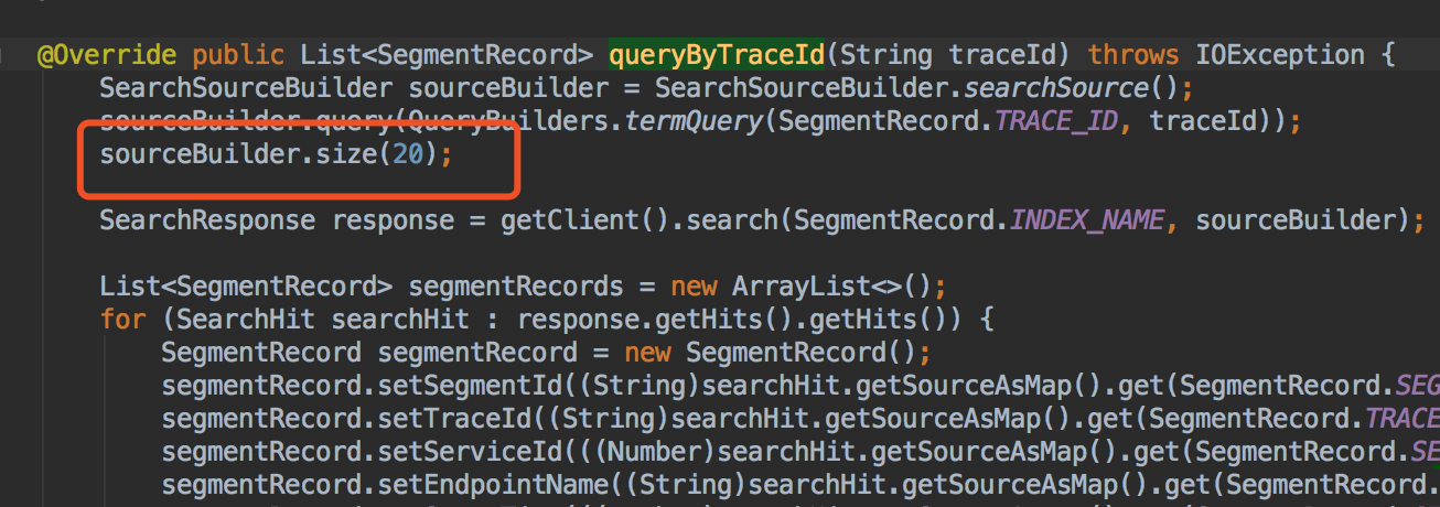 ywf4026 commented on issue #2406: span lost using es storage URL: https://github.com/apache/incubator-skywalking/issues/2406#issuecomment-477883719 > to creat I found the cause. It's the limit size(20) when es query segments by traceid if having more then 20 segments.  I adjust the size to 100, then the trace graph is ok. Anyway, how to set the size may be a quesiton.