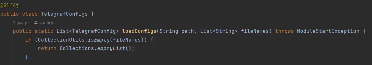 ########## oap-server/server-receiver-plugin/skywalking-telegraf-receiver-plugin/src/main/java/org/apache/skywalking/oap/server/receiver/telegraf/provider/config/TelegrafConfigs.java: ########## @@ -0,0 +1,71 @@ +/* + * Licensed to the Apache Software Foundation (ASF) under one or more + * contributor license agreements. See the NOTICE file distributed with + * this work for additional information regarding copyright ownership. + * The ASF licenses this file to You under the Apache License, Version 2.0 + * (the "License"); you may not use this file except in compliance with + * the License. You may obtain a copy of the License at + * + * http://www.apache.org/licenses/LICENSE-2.0 + * + * Unless required by applicable law or agreed to in writing, software + * distributed under the License is distributed on an "AS IS" BASIS, + * WITHOUT WARRANTIES OR CONDITIONS OF ANY KIND, either express or implied. + * See the License for the specific language governing permissions and + * limitations under the License. + * + */ + +package org.apache.skywalking.oap.server.receiver.telegraf.provider.config; + +import lombok.extern.slf4j.Slf4j; +import org.apache.skywalking.oap.server.library.module.ModuleStartException; +import org.apache.skywalking.oap.server.library.util.CollectionUtils; +import org.apache.skywalking.oap.server.library.util.ResourceUtils; +import org.yaml.snakeyaml.Yaml; + +import java.io.File; +import java.io.FileNotFoundException; +import java.io.FileReader; +import java.io.IOException; +import java.io.Reader; +import java.util.Arrays; +import java.util.Collections; +import java.util.List; +import java.util.Objects; +import java.util.stream.Collectors; + +@Slf4j +public class TelegrafConfigs { + public static List<TelegrafConfig> loadConfigs(String path, List<String> fileNames) throws ModuleStartException { + if (CollectionUtils.isEmpty(fileNames)) { + return Collections.emptyList(); + } + + File[] configs; + try { + configs = ResourceUtils.getPathFiles(path); + } catch (FileNotFoundException e) { + throw new ModuleStartException("Load telegraf configs failed", e); + } + + return Arrays.stream(configs) + .filter(File::isFile) + .map(f -> { + String fileName = f.getName(); + int dotIndex = fileName.lastIndexOf('.'); + fileName = (dotIndex == -1) ? fileName : fileName.substring(0, dotIndex); + if (!fileNames.contains(fileName)) { + return null; + } + try (Reader r = new FileReader(f)) { + return new Yaml().loadAs(r, TelegrafConfig.class); + } catch (IOException e) { + log.warn("Reading file {} failed", f, e); Review Comment: > Please throw module start exception, this is a fatal error I set the `loadConfigs` method throws the `ModuleStartException` , should I change it?  -- This is an automated message from the Apache Git Service. To respond to the message, please log on to GitHub and use the URL above to go to the specific comment. To unsubscribe, e-mail: [email protected] For queries about this service, please contact Infrastructure at: [email protected]