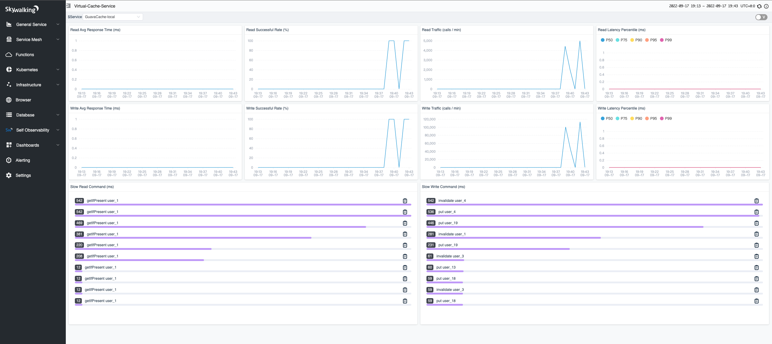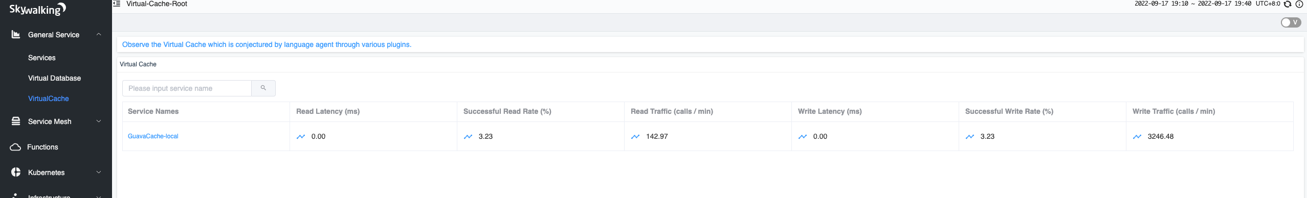 ########## oap-server/server-starter/src/main/resources/ui-initialized-templates/virtual_cache/virtual-cache-root.json: ########## @@ -0,0 +1,122 @@ +/** + * Licensed to the Apache Software Foundation (ASF) under one or more + * contributor license agreements. See the NOTICE file distributed with + * this work for additional information regarding copyright ownership. + * The ASF licenses this file to You under the Apache License, Version 2.0 + * (the "License"); you may not use this file except in compliance with + * the License. You may obtain a copy of the License at + * + * http://www.apache.org/licenses/LICENSE-2.0 + * + * Unless required by applicable law or agreed to in writing, software + * distributed under the License is distributed on an "AS IS" BASIS, + * WITHOUT WARRANTIES OR CONDITIONS OF ANY KIND, either express or implied. + * See the License for the specific language governing permissions and + * limitations under the License. + */ + +[ + { + "id": "Virtual-Cache-Root", + "configuration": { + "children": [ + { + "x": 0, + "y": 2, + "w": 24, + "h": 52, + "i": "0", + "type": "Widget", + "widget": { + "title": "Virtual Cache" + }, + "graph": { + "type": "ServiceList", + "dashboardName": "Virtual-Cache-Service", + "fontSize": 12, + "showXAxis": false, + "showYAxis": false, + "showGroup": false + }, + "metrics": [ + "cache_read_resp_time", + "cache_read_sla", + "cache_read_cpm", + "cache_write_resp_time", + "cache_write_sla", + "cache_write_cpm" + ], + "metricTypes": [ + "readMetricsValues", + "readMetricsValues", + "readMetricsValues", + "readMetricsValues", + "readMetricsValues", + "readMetricsValues" + ], + "moved": false, + "metricConfig": [ + { + "unit": "ms", + "label": "Read Latency", + "calculation": "average" + }, + { + "label": "Successful Read Rate", + "unit": "%", + "calculation": "percentageAvg" + }, + { + "label": "Read Traffic", + "unit": "calls / min", + "calculation": "average" + }, + { + "unit": "ms", + "label": "Write Latency", + "calculation": "average" + }, + { + "label": "Successful Write Rate", + "unit": "%", + "calculation": "percentageAvg" + }, + { + "label": "Write Traffic", + "unit": "calls / min", + "calculation": "average" + } + ] + }, + { + "x": 0, + "y": 0, + "w": 24, + "h": 2, + "i": "100", + "type": "Text", + "metricTypes": [ + "" + ], + "metrics": [ + "" + ], + "graph": { + "fontColor": "blue", + "backgroundColor": "white", + "content": "Observe the Virtual Cache which is conjectured by language agent through various plugins.", + "fontSize": 14, + "textAlign": "left", + "url": "https://skywalking.apache.org/docs/main/latest/en/setup/service-agent/virtual-cache/" + }, + "moved": false + } + ], + "id": "Virtual-Cache-Root", + "layer": "VIRTUAL_CACHE", + "entity": "All", + "name": "Virtual-Cache-Root", + "isRoot": true Review Comment: The UI code I updated:  The screenshot   ########## docs/menu.yml: ########## @@ -111,6 +111,8 @@ catalog: path: "/en/setup/backend/trace-sampling" - name: "Detect Slow Database Statement" path: "/en/setup/backend/slow-db-statement" + - name: "Detect Slow Database Statement" Review Comment: Will be done ########## oap-server/analyzer/agent-analyzer/src/main/java/org/apache/skywalking/oap/server/analyzer/provider/AnalyzerModuleConfig.java: ########## @@ -60,6 +62,23 @@ public class AnalyzerModuleConfig extends ModuleConfig { @Setter @Getter private DBLatencyThresholdsAndWatcher dbLatencyThresholdsAndWatcher; + + @Setter + @Getter + private String slowCacheWriteThreshold = "default:20"; + + @Setter + @Getter + private CacheWriteLatencyThresholdsAndWatcher cacheWriteLatencyThresholdsAndWatcher; + + @Setter + @Getter + private String slowCacheReadThreshold = "default:20"; + + @Setter + @Getter + private CacheReadLatencyThresholdsAndWatcher cacheReadLatencyThresholdsAndWatcher; Review Comment: Will be done -- This is an automated message from the Apache Git Service. To respond to the message, please log on to GitHub and use the URL above to go to the specific comment. To unsubscribe, e-mail: [email protected] For queries about this service, please contact Infrastructure at: [email protected]