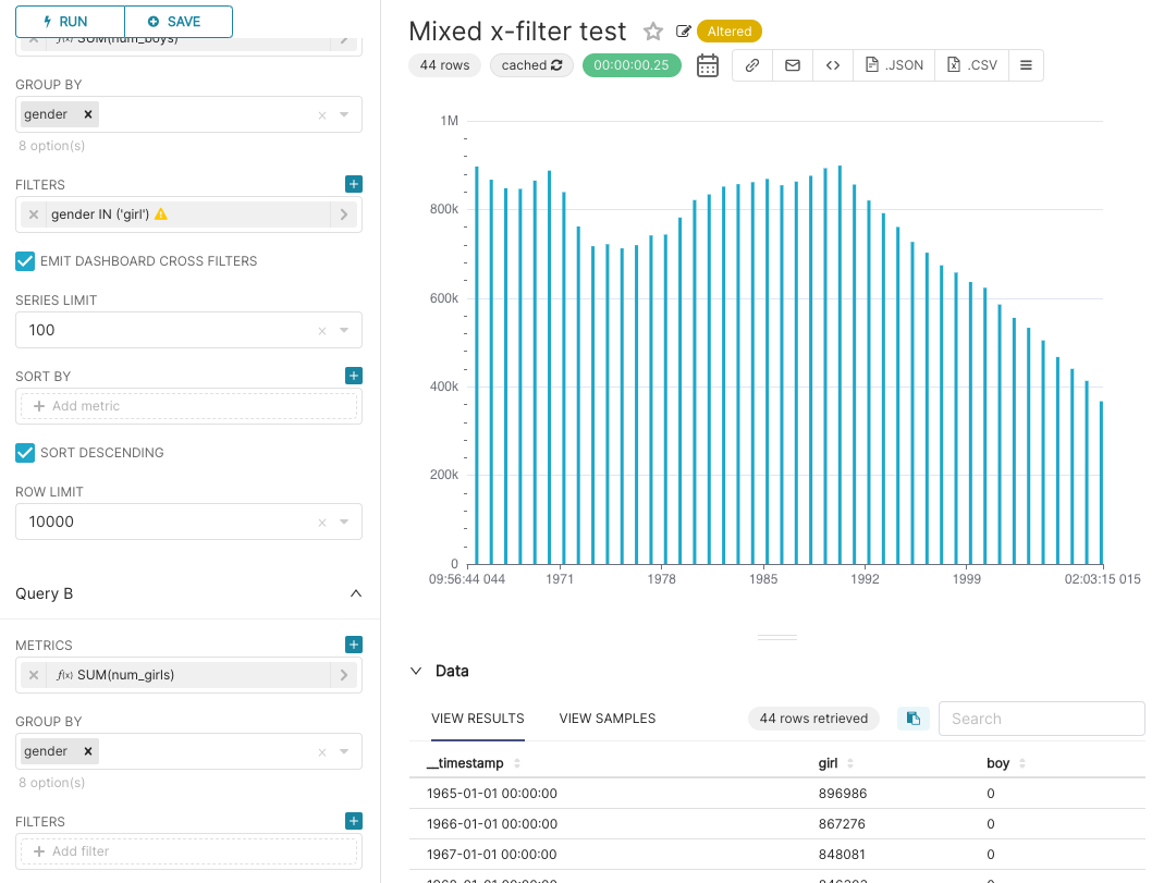 ### SUMMARY Rewrite of https://github.com/apache-superset/superset-ui/pull/1303 by @villebro. When going from the dashboard to Explore view with extra filters (native filters or filter box), the filters are only appended to the first query. In this PR we add the first query's adhoc filters that have isExtra set to true. In addition, the showMinLabel and showMaxLabel contrls are removed, as they're no longer used in the main Timeseries chart. ### BEFORE/AFTER SCREENSHOTS OR ANIMATED GIF Before:  After:  ### TESTING INSTRUCTIONS 1. Create a mixed timeseries chart and add it to a dashboard 2. Go to that dashboard and apply some native filters 3. Click View chart in explore on mixed timeseries chart 4. Verify that native filter is applied in both Query A and Query B adhoc filter control ### ADDITIONAL INFORMATION <!--- Check any relevant boxes with "x" --> <!--- HINT: Include "Fixes #nnn" if you are fixing an existing issue --> - [x] Has associated issue: fixes #15858 - [ ] Required feature flags: - [ ] Changes UI - [ ] Includes DB Migration (follow approval process in [SIP-59](https://github.com/apache/superset/issues/13351)) - [ ] Migration is atomic, supports rollback & is backwards-compatible - [ ] Confirm DB migration upgrade and downgrade tested - [ ] Runtime estimates and downtime expectations provided - [ ] Introduces new feature or API - [ ] Removes existing feature or API -- This is an automated message from the Apache Git Service. To respond to the message, please log on to GitHub and use the URL above to go to the specific comment. To unsubscribe, e-mail: [email protected] For queries about this service, please contact Infrastructure at: [email protected] --------------------------------------------------------------------- To unsubscribe, e-mail: [email protected] For additional commands, e-mail: [email protected]