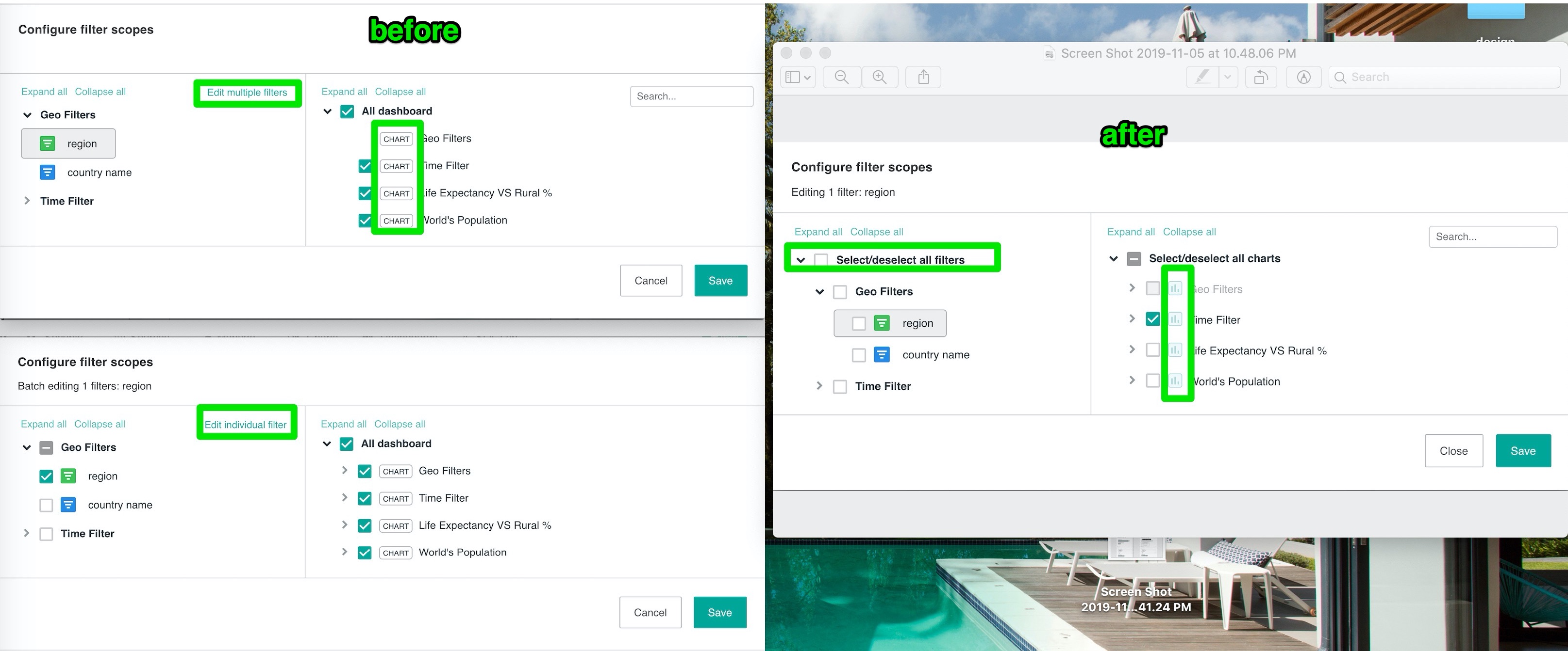 graceguo-supercat edited a comment on issue #8404: [WIP][feature]Dashboard filter scope selector modal URL: https://github.com/apache/incubator-superset/pull/8404#issuecomment-550174368 there are some UI updates based on designers review: - merge single-edit mode + multi-edit mode into one view. - update a chart icon - add root element for filter field pane.