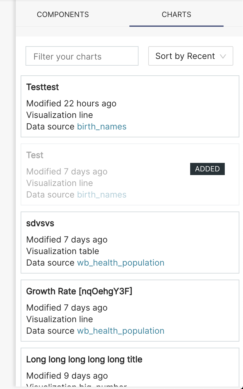 ### SUMMARY Span elements of chart select in BuilderComponentPane were inheriting line-height from `.ant-tabs` class and it increased the total height of SliceCard. In result, cards overlapped each other and the last card was overflowing from cards container. ### BEFORE/AFTER SCREENSHOTS OR ANIMATED GIF Before: see linked issue After:  ### TEST PLAN <!--- What steps should be taken to verify the changes --> ### ADDITIONAL INFORMATION <!--- Check any relevant boxes with "x" --> <!--- HINT: Include "Fixes #nnn" if you are fixing an existing issue --> - [x] Has associated issue: https://github.com/apache/incubator-superset/issues/11756 - [ ] Changes UI - [ ] Requires DB Migration. - [ ] Confirm DB Migration upgrade and downgrade tested. - [ ] Introduces new feature or API - [ ] Removes existing feature or API ---------------------------------------------------------------- This is an automated message from the Apache Git Service. To respond to the message, please log on to GitHub and use the URL above to go to the specific comment. For queries about this service, please contact Infrastructure at: [email protected] --------------------------------------------------------------------- To unsubscribe, e-mail: [email protected] For additional commands, e-mail: [email protected]
