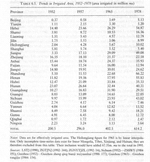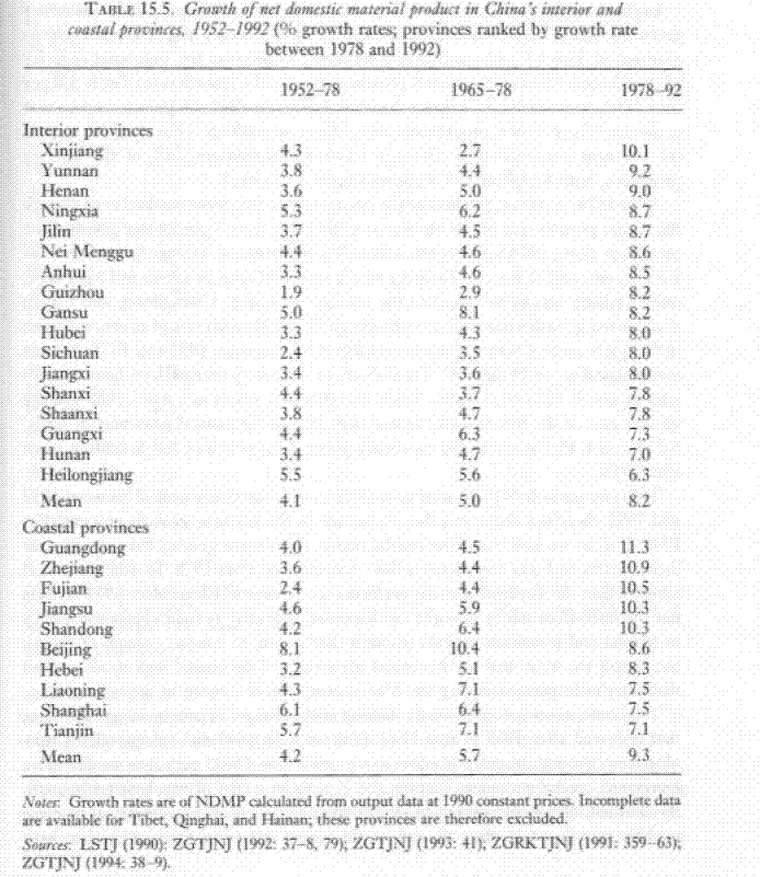 The Maoist contribution to infrastructure As we see, Irrigated area tripled over the Maoist era. In the post Mao era, the rate of growth of irrigated area was not as great, which can be explained somewhat by the fact that less was necessary by then. Now, what was the quality of this irrigation? Pretty good, in fact. We hear horror stories about Maoist irrigation being ineffective or worse, Jung Chang's latest piece of shit book is a case in point. However, Bramall reviews a ton of micro-level evidence (too much to cite here unless someone really wants it) that shows irrigation was generally pretty good about raising yields. http://img.photobucket.com/albums/v488/waltbyars/irrigation.gif http://img.photobucket.com/albums/v488/waltbyars/irrigation2.gif Under the Maoist era, railroad track increased by 3% per year, from 20k KM to 48k KM. The length of metalled roads increased at 8% per year. They both increased at much lower rates during the Dengist era, although utilization rates increased at a very high rate. Thus, mathematically, they had to have inherited substantial underutilized capacity from the previous period. Maoist contribution to education In 1982, the year of the first comprehensive census, total illiteracy was at 32%. We don't have great figures from a year like 1949 or so, but estimates from the 1930s put the male/female rural illiteracy rates at 64%/97% and the urban at 40%/85%. From the major 1982 census, we have detailed information from 5 provinces, including China's largest, on literacy rates and age structure. As is clear from this chart, during the Mao period there was a huge increase in literacy compared to the earlier period. In fact, the chart seriously understates this effect because it ignores the large impact of adult education programs ( see Lavely, Xiao, Li and Freedman "The Rise in Female Education in China" China Quarterly 121 1990). http://img.photobucket.com/albums/v488/waltbyars/education.gif Primary school enrollment in 1952 was 49%. By 1957 it was 62%. By 1965 it was 85% and 97% in 1975. No wonder literacy increased. Secondary school enrollment experienced a large upward trend as well. http://img.photobucket.com/albums/v488/waltbyars/secondary.gif China's "Agricultural Miracle" One of the biggest misconceptions is that decollectivization caused the agricultural "miracle" in China from 1980-84. This is untenable because in the 1980s, agricultural output increased at a similar rate in areas which were decollectized and not decollectivized, as well as among areas which had made different progress on the decollectivization process. Bramall makes this argument in detail in "Chinese Land Reform in the Long run Perspective and the Wider East Asian Context" Journal of Agrarian Change 4.1-2 (2004). As he states "The early group (Anhui, Gansu, Guangxi, Guizhou and Ningxia) saw their median agricultural growth rate rise from 3.5 per cent during 197680 to 9.3 per cent during 19804, a ratio (the growth bonus) of 2.7.25 However, the late group (Heilongjiang, Jilin and Liaoning provinces) did equally well; their median growth rate rose from 3.9 to 10.5 per cent." He points out also that agricultural output grew at a rate of 4.6% per annum in 1976-80, twice as high as the previous ten years. Also, the weather was much poorer during this time than before or after. However, there was no decollectivization except in parts of Anhui during this period! What did cause the miracle? Bramall documents in detail that the Chinese state had recently completed important infrastructural projects and scientific development projects of great relevance to agricultural inputs. What were the consequences of this miracle? the creation of surplus labor that could go into industry, of course. There is this myth about "surplus labor" in the Maoist period that Bramall utterly refutes in detail. Thankfully, he includes a chart the gives a good "gee whiz" statistic. At Mao's death the surplus in labor was negative(i.e. people had to work more than the typical working year in order to produce everything), the surplus was created by the agricultural miracle! http://img.photobucket.com/albums/v488/waltbyars/surplus.gif the Role of Foreign Trade and FDI The conventional wisdom holds that the role of trade in China's economy grew heavily in the post Mao period, and that this to a large extent facilitated growth. It is correct that the role of trade grew alot, but first of all its difficult to determine causality. There is lots of evidence that as economies grow, they start exporting more (see any of Dani Rodrik's writings criticizing studies that try to show cross-national correlations between growth and "openness") because it takes strong firms to be competitive in alot of export markets. The sophsiticated versions of the "trade caused growth" argument point to the greater growth of the coastal than the interior provinces. However, these coastal provinces grew more than the interior provinces during the Mao period as well. http://img.photobucket.com/albums/v488/waltbyars/provincialgrowth.gif It is very difficult to argue that FDI caused China's growth because until the mid 1990s, it was a negligible portion of investment. http://img.photobucket.com/albums/v488/waltbyars/fdi.gif Then we get to the supposedly large portion of GDP that Chinese foreign trade accounts for. The problem is that China's currency is significantly undervalued and, as is well known, their nominal GDP is seriously understated. It is almost certain that their foreign trade, however, is not understated or only neglibgibly so by the official figures. The following is Bramall's comparison of exports to GDP in purchasing power parity terms. I think PPP is a useless measure but I'll just point out that the role of exports in GDP calculated in PPP terms never gets more than 10 percent. The Third Front One of the main reasons China's economy performed better in the post Mao period is the cessation of the third front program. This was t