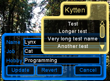 This new release adds checkboxes and sliders, as well as a lot of code cleanup and bug fixes. I revised the default GUI theme as well. Here's a screenshot showing a scrollable menu in a titled frame, and a regular form: