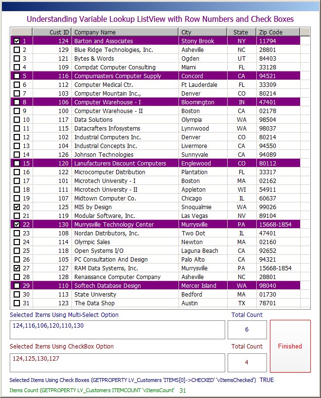Wednesday, January 14, 2015 Sample Application: Using Variable Lookup List View Row Numbers & Check Boxes Product..: R:BASE eXtreme 9.5 (32/64) - Update 5 Build....: 9.5.5.20109 or higher Section..: Form Controls (Variable Lookup List View) Keywords.: Row Numbers, Check Boxes