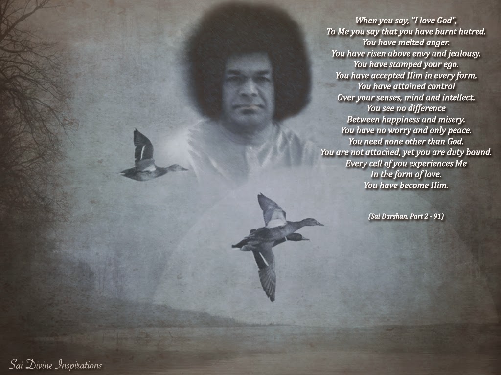 <http://2.bp.blogspot.com/-tWxwymiLyjw/VFGTe9SGlPI/AAAAAAAAu3E/gHR7xJlrJJs/s1600/SD2-91.jpg> http://2.bp.blogspot.com/-tWxwymiLyjw/VFGTe9SGlPI/AAAAAAAAu3E/gHR7xJlrJJs/s1600/SD2-91.jpg <http://2.bp.blogspot.com/-tWxwymiLyjw/VFGTe9SGlPI/AAAAAAAAu3E/gHR7xJlrJJs/s1600/SD2-91.jpg> <http://2.bp.blogspot.com/-tWxwymiLyjw/VFGTe9SGlPI/AAAAAAAAu3E/gHR7xJlrJJs/s1600/SD2-91.jpg> View on 2.bp.blogspot.com Preview by Yahoo When you say, "I love God", To Me you say that you have burnt hatred. You have melted anger. You have risen above envy and jealousy. You have stamped your ego. You have accepted Him in every form. You have attained control Over your senses, mind and intellect. You see no difference Between happiness and misery. You have no worry and only peace. You need none other than God. You are not attached, yet you are duty bound. Every cell of you experiences Me In the form of love. You have become Him. >From : 'Sai Darshan' - Part II (Divine Messages received and recorded by Mrs Seema M Dewan) Awaken the Divine within you... http://mail.yimg.com/us.yimg.com/i/mesg/tsmileys2/40.gif Love All, Serve All http://mail.yimg.com/us.yimg.com/i/mesg/tsmileys2/40.gif -- --- You received this message because you are subscribed to the Google Groups "saimsg" group. To unsubscribe from this group and stop receiving emails from it, send an email to [email protected]. For more options, visit https://groups.google.com/d/optout.
