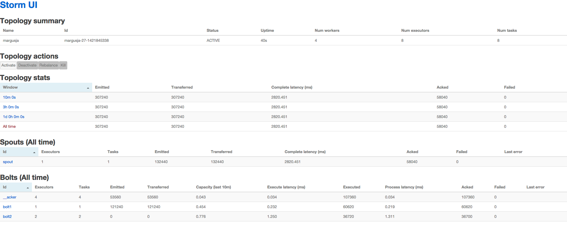 On Wed, Jan 21, 2015 at 10:10 AM, Margus Roo <[email protected]> wrote: > Okey, I think I figured out why I thought this option was ignored. > nextTuple executes a new thred and does not know anything about it anymore. > > I have wrong coded spout :) > > private class KafkaReader implements Runnable { > > @Override > public void run() { > Map<String, List<KafkaStream<byte[], byte[]>>> consumerStreams > = kafkaConsumer.createMessageStreams(kafkaTopicThreads); > List<KafkaStream<byte[], byte[]>> streams = > consumerStreams.get(kafkaTopic); > > for (KafkaStream stream : streams) { > ConsumerIterator<byte[], byte[]> iterator = > stream.iterator(); > > while (iterator.hasNext()) { > String line = new String(iterator.next().message()); > collector.emit(new Values(line), messageId); > messageId++; > } > } > > if (kafkaConsumer != null) { > log.info("Shutting down consumer. Last messageId=" + > messageId); > kafkaConsumer.shutdown(); > } > } > } > > @Override > public void nextTuple() { > if (kafkaReader == null) { > // Kafka queue reader is blocking, so it needs to run in a > separate thread, otherwise ACK/FAIL messages > // will never be processed (their count will always remain 0) > kafkaReader = new Thread(new KafkaReader()); > kafkaReader.start(); > } > > try { > // how often do we give Storm a chance to process ACKs and > FAILs > Thread.sleep(RETURN_INTERVAL); > } catch (InterruptedException e) { > throw new RuntimeException(e); > } > } > > > > Margus (margusja) Roohttp://margus.roo.ee > skype: margusja > +372 51 480 > > On 21/01/15 16:15, Margus Roo wrote: > > Hi > > Here is my topology class: > > public class Topology { > > public static void main(String[] args) throws Exception { > Config conf = new Config(); > conf.setDebug(false); > > TopologyBuilder builder = new TopologyBuilder(); > > builder.setSpout("spout", new KafkaConsumerSpout()); > builder.setBolt("bolt1", new > DataStructureBolt()).shuffleGrouping("spout"); > builder.setBolt("bolt2", new HBaseWriterBolt(), > 2).setNumTasks(2).shuffleGrouping("bolt1"); > > if (args.length > 0) { > // if you wish to run your job on a remote cluster > conf.setNumWorkers(4); > conf.put(Config.NIMBUS_THRIFT_PORT, 6627); > conf.put(Config.STORM_ZOOKEEPER_PORT, 2181); > conf.put(Config.WORKER_CHILDOPTS , "-Xmx4096m"); > conf.put(Config.TOPOLOGY_WORKER_CHILDOPTS , "-Xmx4096m"); > conf.put(Config.TOPOLOGY_MAX_SPOUT_PENDING , 10); > > StormSubmitter.submitTopology(args[0], conf, > builder.createTopology()); > } else { > // if you wish to run and test your job locally > conf.setMaxTaskParallelism(1); > > LocalCluster cluster = new LocalCluster(); > cluster.submitTopology("kafkatopology", conf, > builder.createTopology()); > Thread.sleep(10000); > cluster.shutdown(); > } > } > > } > > even more I set in storm config file > topology.max.spout.pending: 10 > > > I can see in storm UI: > > topology.max.spout.pending 10 > > but still there is emitted much bigger than ack from spout. > > > Margus (margusja) Roohttp://margus.roo.ee > skype: margusja > +372 51 480 > > On 21/01/15 15:18, Nathan Leung wrote: > > Your image looks consistent with a very high value for max spout pending. > Is there any chance that it is set manually on the spout when you are > building your topology? > On Jan 21, 2015 8:07 AM, "Margus Roo" <[email protected]> wrote: > >> I made some pictures to describe the situation >> >> upload topology to storm server >> >> http://margus.roo.ee/wp-content/uploads/2015/01/Screenshot-2015-01-21-15.02.39.png >> >> storm UI >> >> http://margus.roo.ee/wp-content/uploads/2015/01/Screenshot-2015-01-21-15.03.13.png >> >> pending = 1 >> >> http://margus.roo.ee/wp-content/uploads/2015/01/Screenshot-2015-01-21-15.03.36.png >> >> any comments. I hoped to see same number behind spout emitted and ack >> >> Margus (margusja) Roohttp://margus.roo.ee >> skype: margusja >> +372 51 480 >> >> On 21/01/15 14:57, Nathan Leung wrote: >> >> Your understanding is correct. Note that it is per spout task, so if you >> have 10 tasks then you could have 10 tuples in queue simultaneously. Are >> your emits and acks for topology or spout only? Also note that if your bolt >> does not emit using the incoming tuple as an anchor then storm will mark >> the tuple tree as finished and your spout will be able to emit another >> tuple. >> On Jan 21, 2015 7:50 AM, "Margus Roo" <[email protected]> wrote: >> >>> Hi >>> >>> I have topology.max.spout.pending = 1. >>> but i think my spout emits much more than I want. In example there are >>> 762400 emitted and >>> 381200 ack. >>> As I understand topology.max.spout.pending it allows configured numbers >>> of pending messages in spouts output queue in the time. So if >>> topology.max.spout.pending = 1 then there can be only one message in the >>> queue? >>> >>> -- >>> Margus (margusja) Roohttp://margus.roo.ee >>> skype: margusja >>> +372 51 480 >>> >>> >> > >