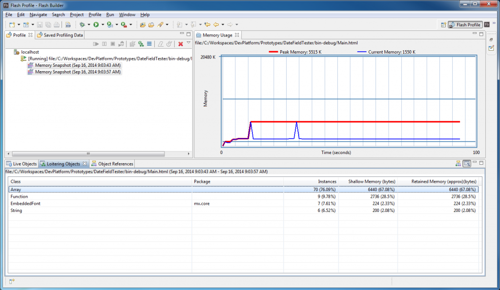 Modifying the steps so that I create and remove a DateField before taking snapshot, then doing it again I still get the following stuff loitering: http://i629.photobucket.com/albums/uu19/drevans112/Allocate/Profiler-Add-DateField-Controls.png Surely the basic DateField is leaking. Alex Harui wrote > The first time you run code, it can create new Class and Function objects. > I would probably create and remove once, then take a starting snapshot. > If the component is leaking, it usually will show up in subsequent > snapshots, unless there is some first-time initialization code. > > The class and function objects shouldn't cause leaks: they are tied to the > SWF that brought them in. I'm a bit surprised that two managers were > instantiated, but I don't know the code well enough OTOH to say that it is > a problem. > > -Alex -- View this message in context: http://apache-flex-users.2333346.n4.nabble.com/Using-Adobe-Scout-to-locate-memory-leak-tp7770p8003.html Sent from the Apache Flex Users mailing list archive at Nabble.com.