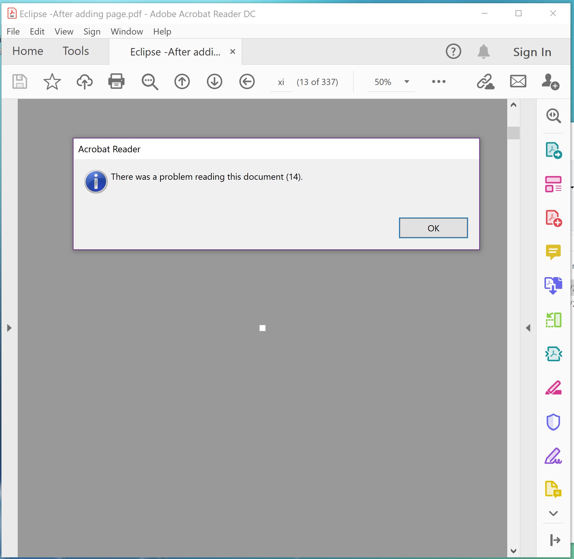 Best regards, Hesham ---------------------------------------------------------------------------- ---------------------- Included Message: Page 11 has the wrong parent. It is 13881 but should be 90. However a similar problem is in the source file. Parent points to 98 but should be 18564. Tilman Am 27.01.2021 um 12:41 schrieb Hesham Gneady: Hello, I am trying to add a blank page to a PDF file after specific page, using PDFBox 2.0.21. For some PDFs it works fine, but for others when opening the PDF using Adobe Reader or any reader the PDF becomes totally ruined. Many pages have 0 dimensions. Zooming becomes wrong, and I get error "There was a problem reading this document (14)". Here is my code: PDDocument pdfDocument = PDDocument.load( pdfFile ); PDPageTree rootPages = pdfDocument.getPages(); PDPage blankPage = new PDPage( PDRectangle.A4 ); rootPages.insertAfter( blankPage, pdfDocument.getPage( 2 ) ); pdfDocument.save( pdfFile.getAbsoluteFile() ); pdfDocument.close(); As a sample PDF, here is an original PDF file: https://dl.dropboxusercontent.com/s/dj5rzy7f47k8e3f/Eclipse.pdf?dl=0 <https://www.dropbox.com/s/dj5rzy7f47k8e3f/Eclipse.pdf?dl=0> <https://www.dropbox.com/s/dj5rzy7f47k8e3f/Eclipse.pdf?dl=0> Then after appending a blank page to it: https://dl.dropboxusercontent.com/s/q5qgj24bu9nves2/Eclipse%20-After%20addin g%20page.pdf?dl=0 <https://www.dropbox.com/s/q5qgj24bu9nves2/Eclipse%20-After%20adding%20page. pdf?dl=0> <https://www.dropbox.com/s/q5qgj24bu9nves2/Eclipse%20-After%20adding%20page. pdf?dl=0 <https://www.dropbox.com/s/q5qgj24bu9nves2/Eclipse%20-After%20adding%20page. pdf?dl=0> > And here is the error message when viewing the PDF: https://dl.dropboxusercontent.com/s/2peynubfwwgeeu7/Eclipse%20-After%20addin g%20page%20-%20Error.jpg?dl=0 I have the same problem for more than 1 PDF. Is there a way to fix that? Best regards, Hesham