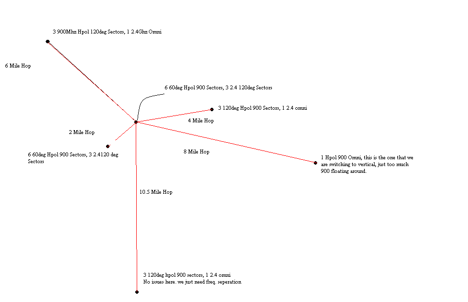 Here is a crude picture of one of our areas. Aside from the one site everything works great. 18 Canopy 900 Sectors in a 6 mile radius. Plus 2 Vertical that are not in the image. Need less to say that town is pretty well smoked.