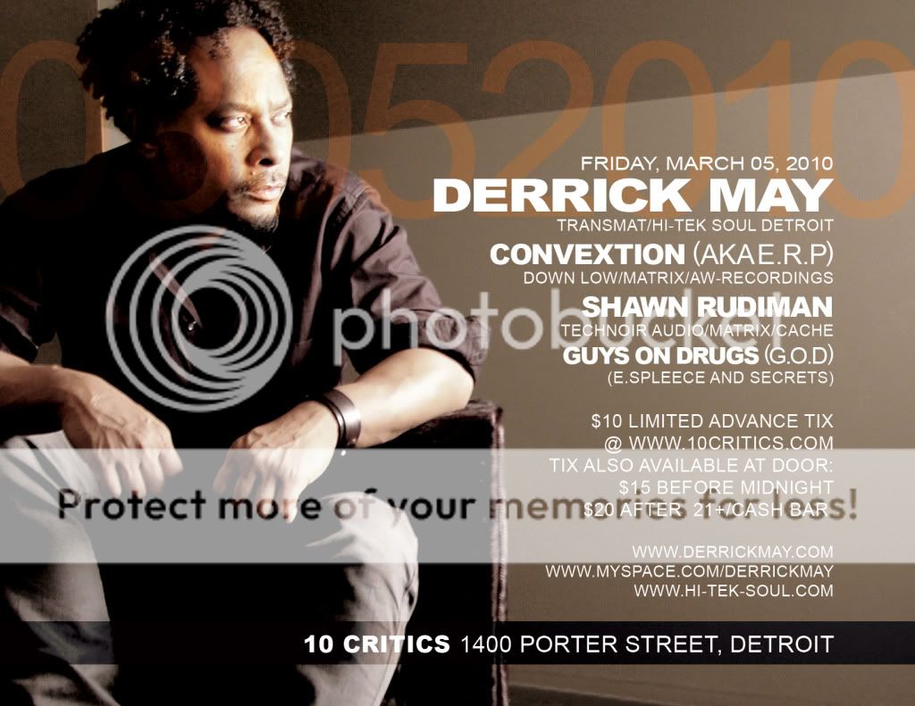 w/10 Critics Residents Guys on Drugs (E.Spleece and Secrets) 21+/Cash Bar Doors open at 10pm $10 Limited Advance Ticket info will be available at www.10critics.com... $15 before Midnight/$20 after Midnight flyer: http://i863.photobucket.com/albums/ab192/MatrixRecords/DerrickMayBack.jpg I'm not involved, just spreading the word since it hasn't been mentioned here