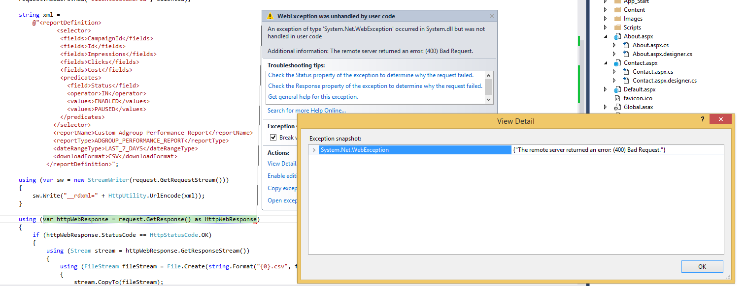 For those selectors you mentioned, I think the main purpose of them is to just get the properties of entities themselves, not statistics around them. But please wait until I get more information about the design of these selectors. Regarding your second question, I'm afraid that it may be difficult for us to debug your code according to security and privacy concerns. Could you please re-check your access token, developer token and client customer ID? If you can provide SOAP request & response logs, that would be much easier for us to debug together. (Please be sure to strip your personal information off) For now, I recommend you to try our code example <https://github.com/googleads/googleads-dotnet-lib/blob/master/examples/AdWords/CSharp/v201502/Reporting/DownloadCriteriaReport.cs>first to see if everything is fine before trying external code example. Though you don't need to use client libraries all the time, they may be a good start to see if your settings have no problems. :-) Cheers, Thanet On Friday, March 27, 2015 at 12:04:09 AM UTC+9, Samuel Otero wrote: > > Hello Thanet. I really appreciate your fast answer. > > I'm also working with the reporting feature approach, and I get an error > saying "bad request". Maybe I'm missing something obvious in the > definition. I was thinking to open another topic for it, but now that you > mention it, I should take advantage right now :) > > Ok let's go by parts. First, I need to find a way anyway to retrieve those > clicks using these selectors > <https://developers.google.com/adwords/api/docs/appendix/selectorfields#v201409-AdGroupService>, > > because our company want to see both approaches working, so please, if you > can help me with that, I will really appreciate it. > > Now... about the reporting feature, this is what I am trying to do, > following a combination of these instructions > <https://developers.google.com/adwords/api/docs/guides/reporting> and this > example <https://gist.github.com/ElvisLives/1287940>: > > string URL = " > https://adwords.google.com/api/adwords/reportdownload/v201409"; > > string authToken = "xxxxxxx"; > string clientId = "xxxxxx"; > string fileName = "prueba"; > string developerToken = "xxxxxx"; > > var request = WebRequest.Create(URL) as HttpWebRequest; > request.ContentType = "application/x-www-form-urlencoded"; > request.Method = "POST"; > request.Headers.Add("Authorization", "Bearer " + authToken ); > request.Headers.Add("developerToken", developerToken); > request.Headers.Add("clientCustomerId", clientId); > > string xml = > @"<reportDefinition> > <selector> > <fields>CampaignId</fields> > <fields>Id</fields> > <fields>Impressions</fields> > <fields>Clicks</fields> > <fields>Cost</fields> > <predicates> > <field>Status</field> > <operator>IN</operator> > <values>ENABLED</values> > <values>PAUSED</values> > </predicates> > </selector> > <reportName>Custom Adgroup Performance > Report</reportName> > <reportType>ADGROUP_PERFORMANCE_REPORT</reportType> > <dateRangeType>LAST_7_DAYS</dateRangeType> > <downloadFormat>CSV</downloadFormat> > </reportDefinition>"; > > using (var sw = new StreamWriter(request.GetRequestStream())) > { > sw.Write("__rdxml=" + HttpUtility.UrlEncode(xml)); > } > > using (var httpWebResponse = request.GetResponse() as > HttpWebResponse) > { > if (httpWebResponse.StatusCode == HttpStatusCode.OK) > { > using (Stream stream = > httpWebResponse.GetResponseStream()) > { > using (FileStream fileStream = > File.Create(string.Format("{0}.csv", fileName))) > { > stream.CopyTo(fileStream); > } > } > } > } > > I replaced the AuthToken, clientId and the Developer Token just for > security. When I run this code, I get an exception saying "Bad Request"... > > Example: > > > <https://lh3.googleusercontent.com/-6W0slKg19PQ/VRQe9N_jXsI/AAAAAAAAAB8/vVmLk6ZRYJM/s1600/Reports%2BException.PNG> > > > If I'm missing something obvious, just bare with me, because this is my > first HTTP request, and first time working with Google Api also. > > Can you point me into the right direction? Why I receive the exception of > bad request??? Also, there is a way to retrieve those clicks using these > <https://developers.google.com/adwords/api/docs/appendix/selectorfields#v201409-AdGroupService> > ? > > I will be kinda staring at my monitor waiting for your answer hehe. > > Thank you sir. > > On Thursday, March 26, 2015 at 10:13:58 AM UTC-4, Thanet Knack > Praneenararat (AdWords API Team) wrote: >> >> Hi Samuel, >> >> Based on what you've described, it seems you may want to use reporting >> <https://developers.google.com/adwords/api/docs/guides/reporting> >> feature of the API. >> >> To get number of clicks and impressions for each campaign, you can use >> Campaign >> Performance Report >> <https://developers.google.com/adwords/api/docs/appendix/reports/campaign-performance-report> >> >> to obtain those relevant fields. >> >> Please refer to this C# code example >> <https://github.com/googleads/googleads-dotnet-lib/blob/master/examples/AdWords/CSharp/v201502/Reporting/DownloadCriteriaReport.cs> >> for >> more information. >> In the code, Criteria Performance Report >> <https://developers.google.com/adwords/api/docs/appendix/reports/criteria-performance-report> >> >> is specified but you can adapt to use Campaign Performance Report quite >> easily. >> >> Best, >> Thanet, AdWords API Team >> >> On Thursday, March 26, 2015 at 7:18:27 AM UTC+9, Samuel Otero wrote: >>> >>> Hi everyone. If someone can help me, I will really appreciate it. >>> >>> I am trying to get some basic information from a Campaign under my test >>> MCC account. I am using Selector Fields >>> <https://developers.google.com/adwords/api/docs/appendix/selectorfields#v201409-AdGroupService> >>> to >>> do so. >>> >>> I can get the Campaign Id, the Campaign Name, and some other info... but >>> I just cannot find a way to retrieve the number of click at the Campaign >>> Level, nor the Ad Groups level. >>> >>> Basically, I'm just trying to get all the informati
